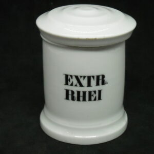 Antique porcelain apothecary container “EXTR. RHEI”.