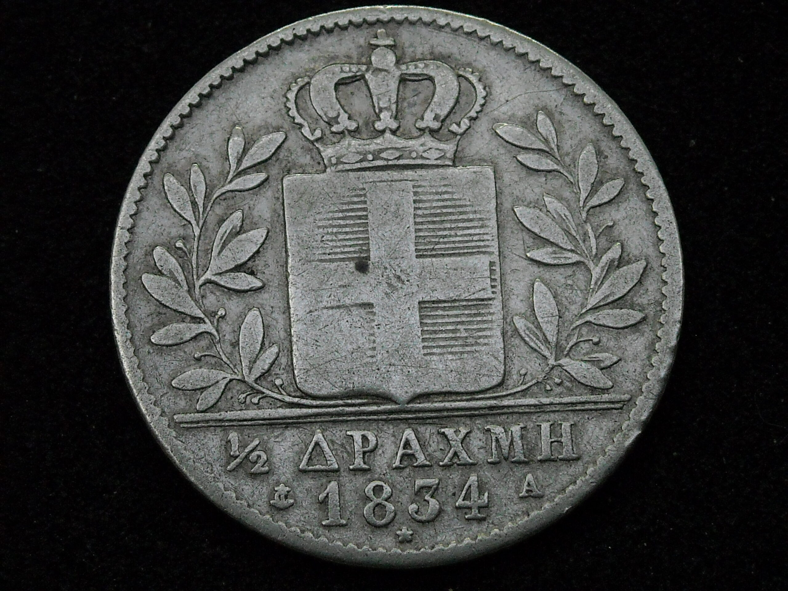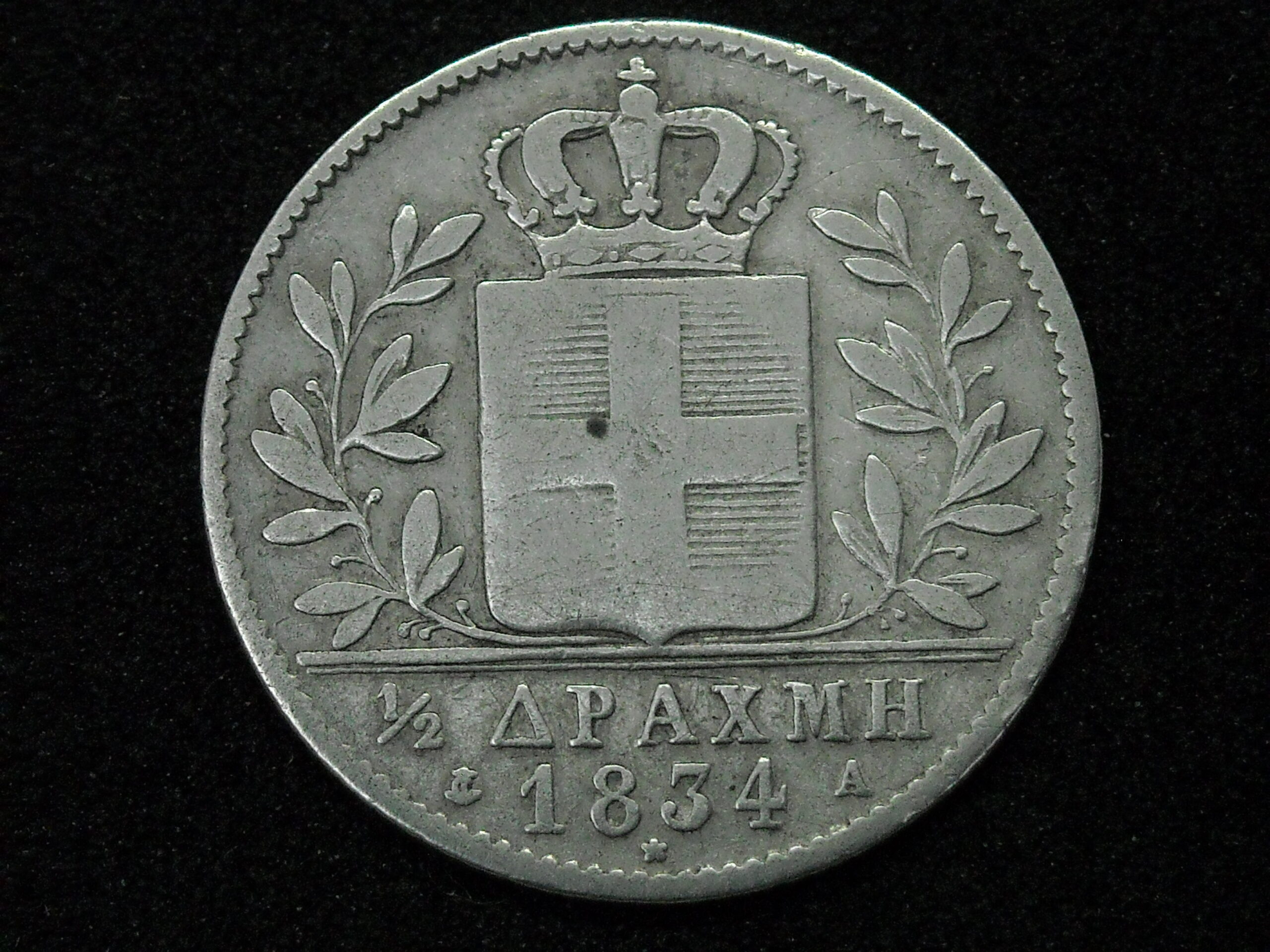 1834 1/2 DRACHMA (.900 SILVER COIN) “OTTO KING OF GREECE”. THE QUALITY ASSESSMENT OF CURRENCY IS SUBJECTIVE.