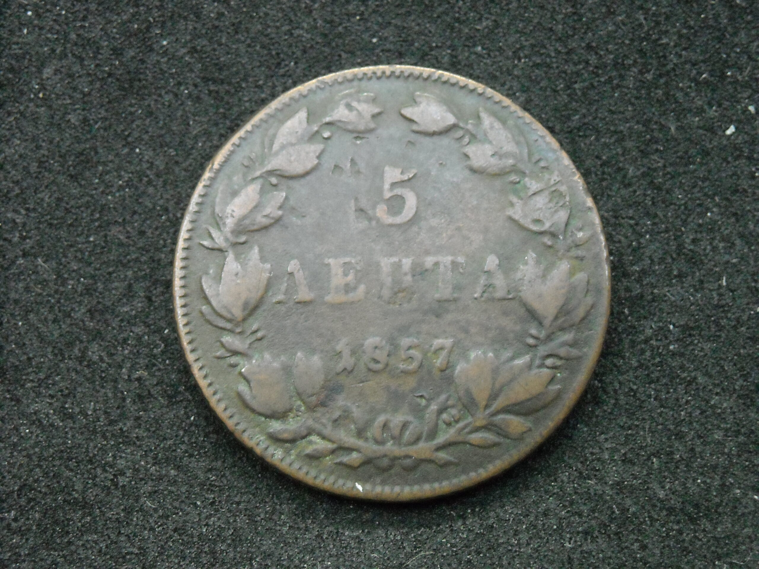 1857 5 LEPTA COIN “KINGDOM OF GREECE- KING OTTO”. COPPER COIN. THE QUALITY ASSESSMENT OF CURRENCY IS SUBJECTIVE.
