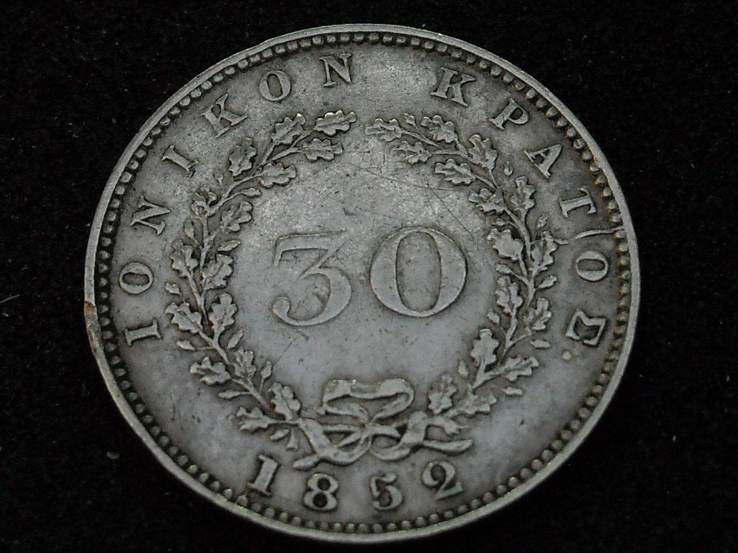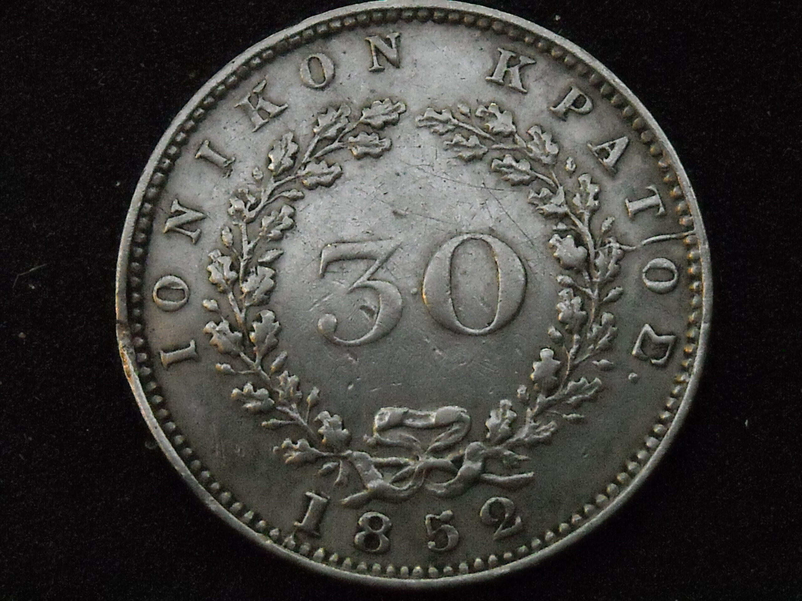 1852 30 Obols (SILVER .925) “IONIAN ISLANDS STATE”. STRIKE ON PERIMETER. THE ASSESSMENT OF CURRENCY QUALITY IS SUBJECTIVE.