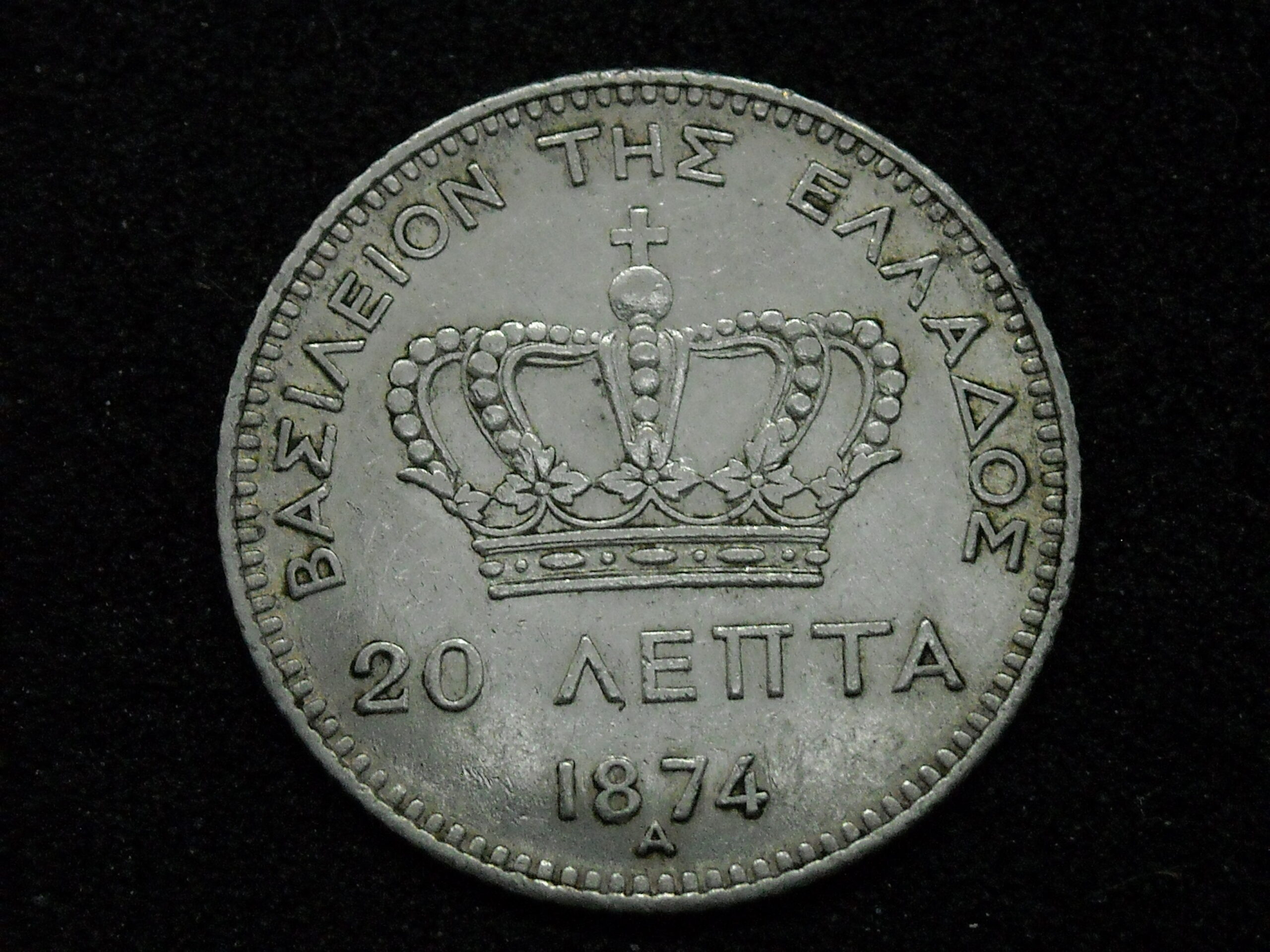 1874 20 LEPTA (.835 SILVER COIN) OF KING GEORGE I. THE QUALITY ASSESSMENT OF CURRENCY IS SUBJECTIVE.