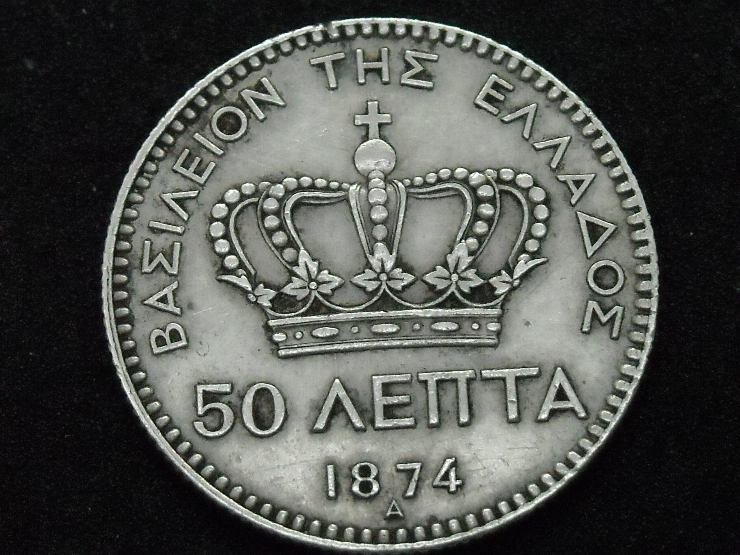1874 50 LEPTA (.835 SILVER COIN) OF KING GEORGE I. THE QUALITY ASSESSMENT OF CURRENCY IS SUBJECTIVE.