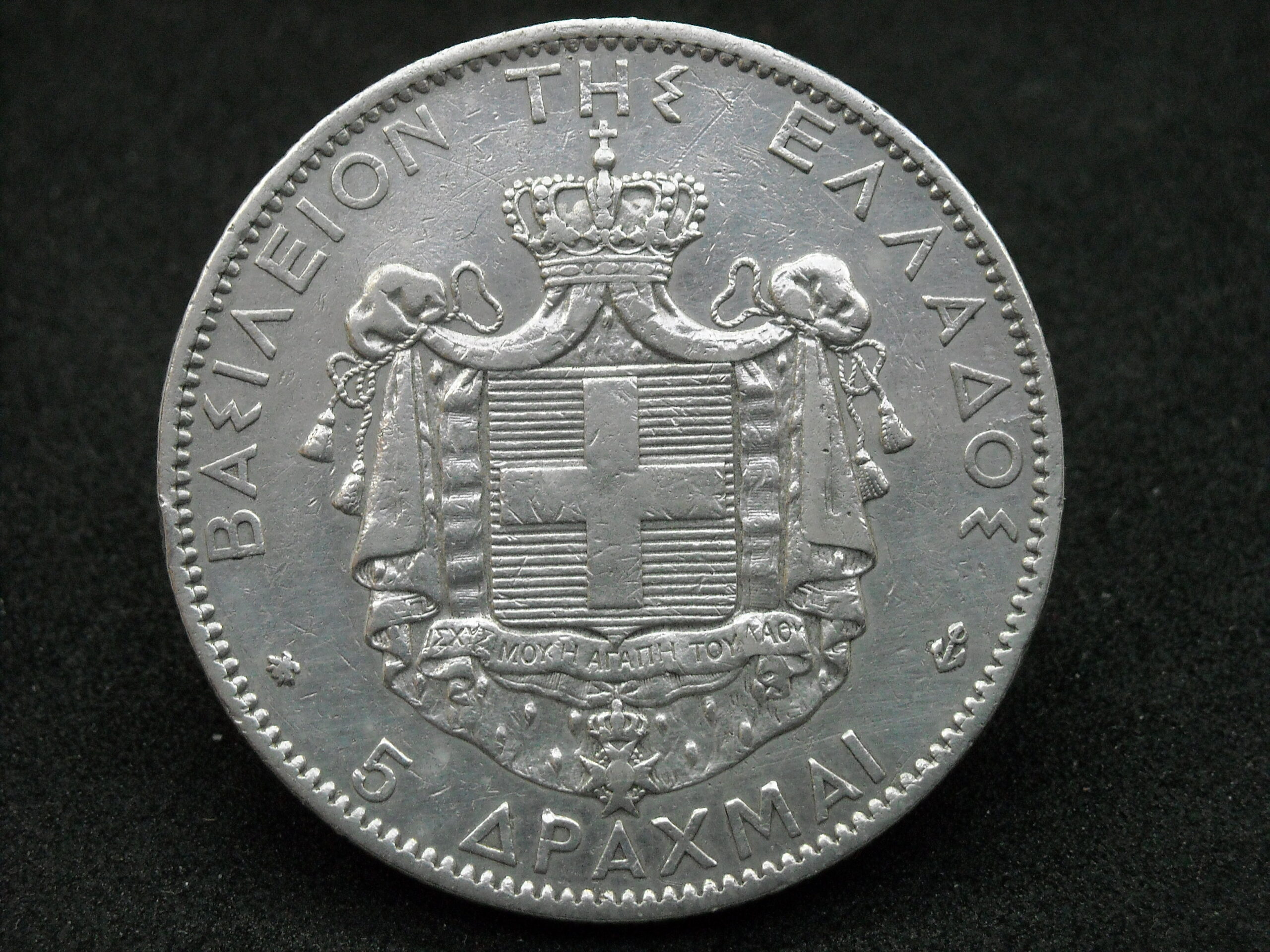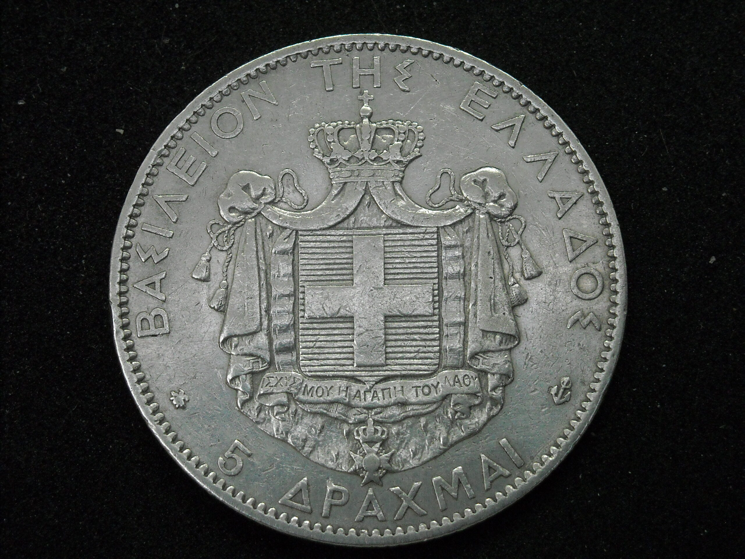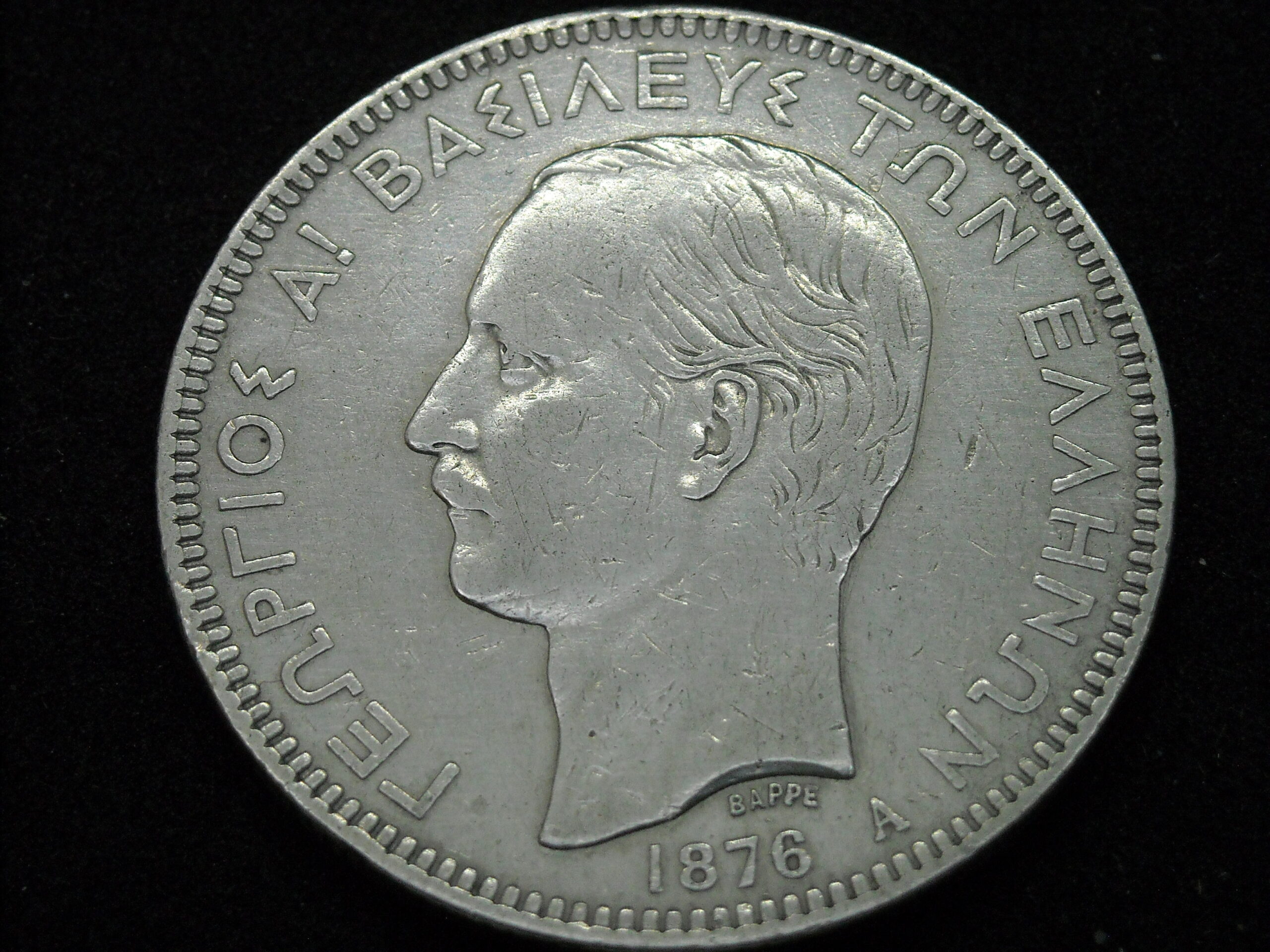 1876 5 DRACHMAS (SILVER .900) COIN OF KING GEORGE I. THE QUALITY ASSESSMENT OF CURRENCY IS SUBJECTIVE.