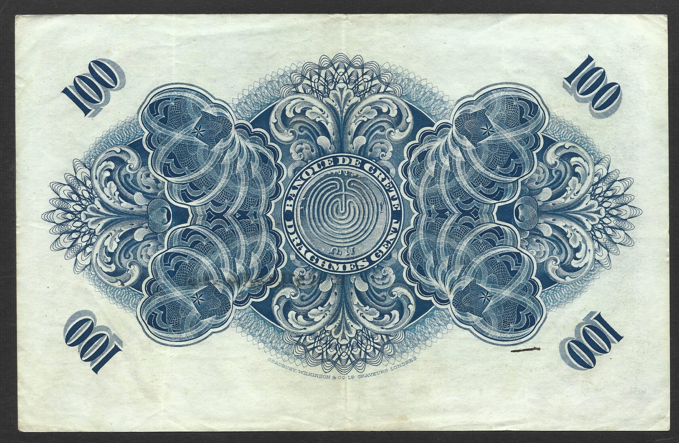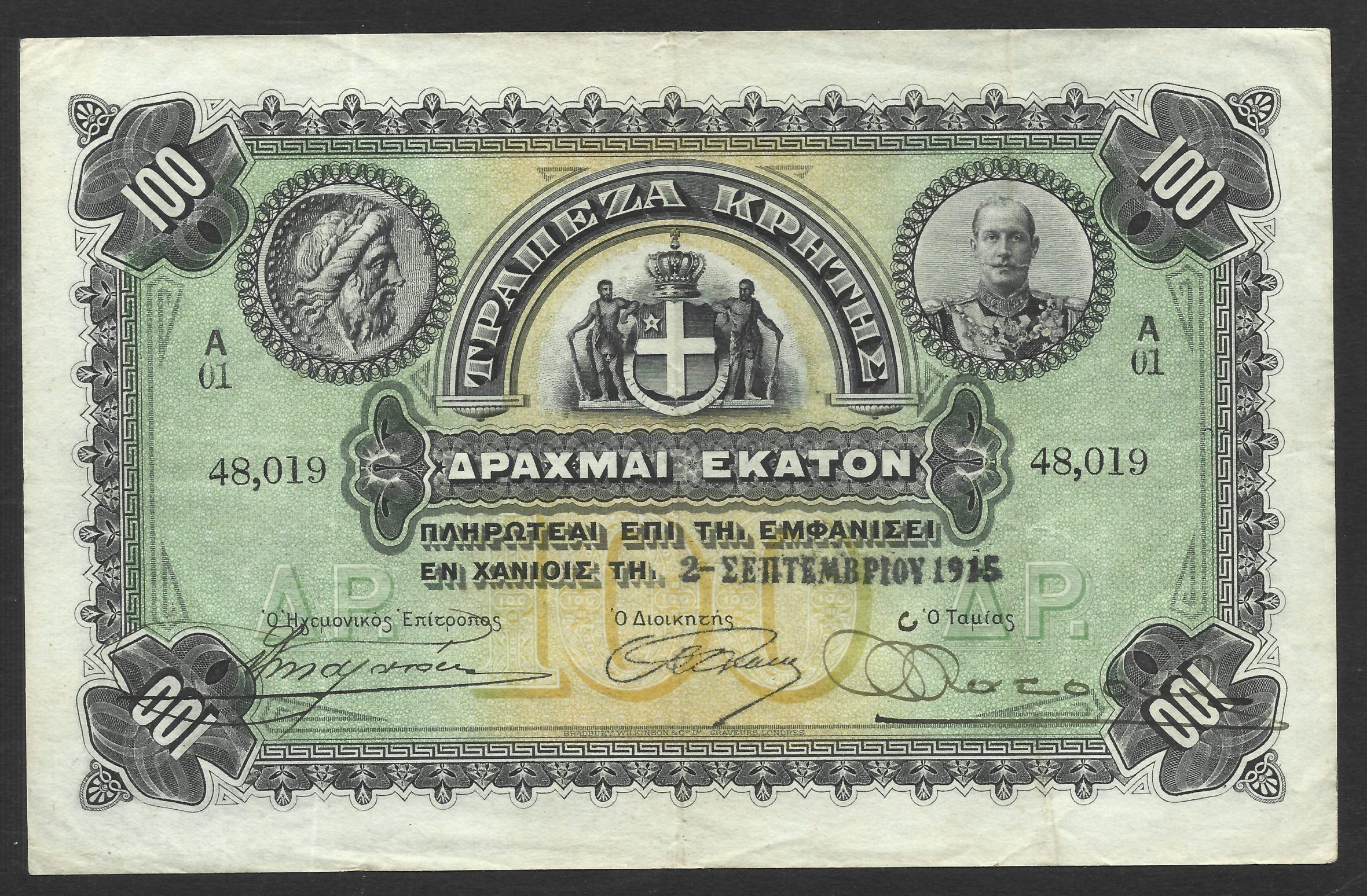 1915/02/09 100 DRACHMA “BANK OF CRETE” Printed by Bradbury Wilkinson. Original paper quality not pressed not washed without tears. Excellent banknote and hard to find.