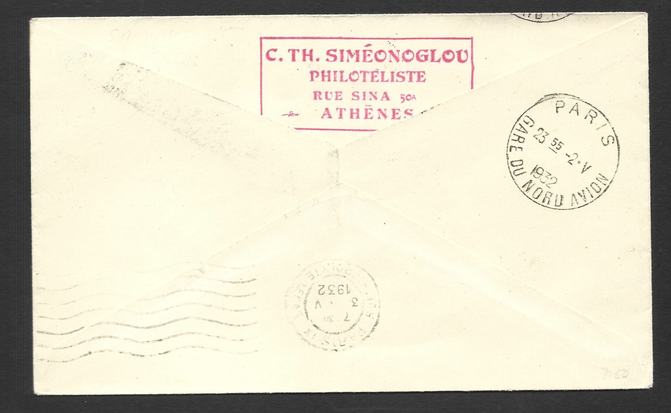 1932/01/05 Commemorative first fligt cachet “ATHENS-PARIS” with label and cachet “Par-Avion”. Dimensions 15.7cm X 9.5cm.