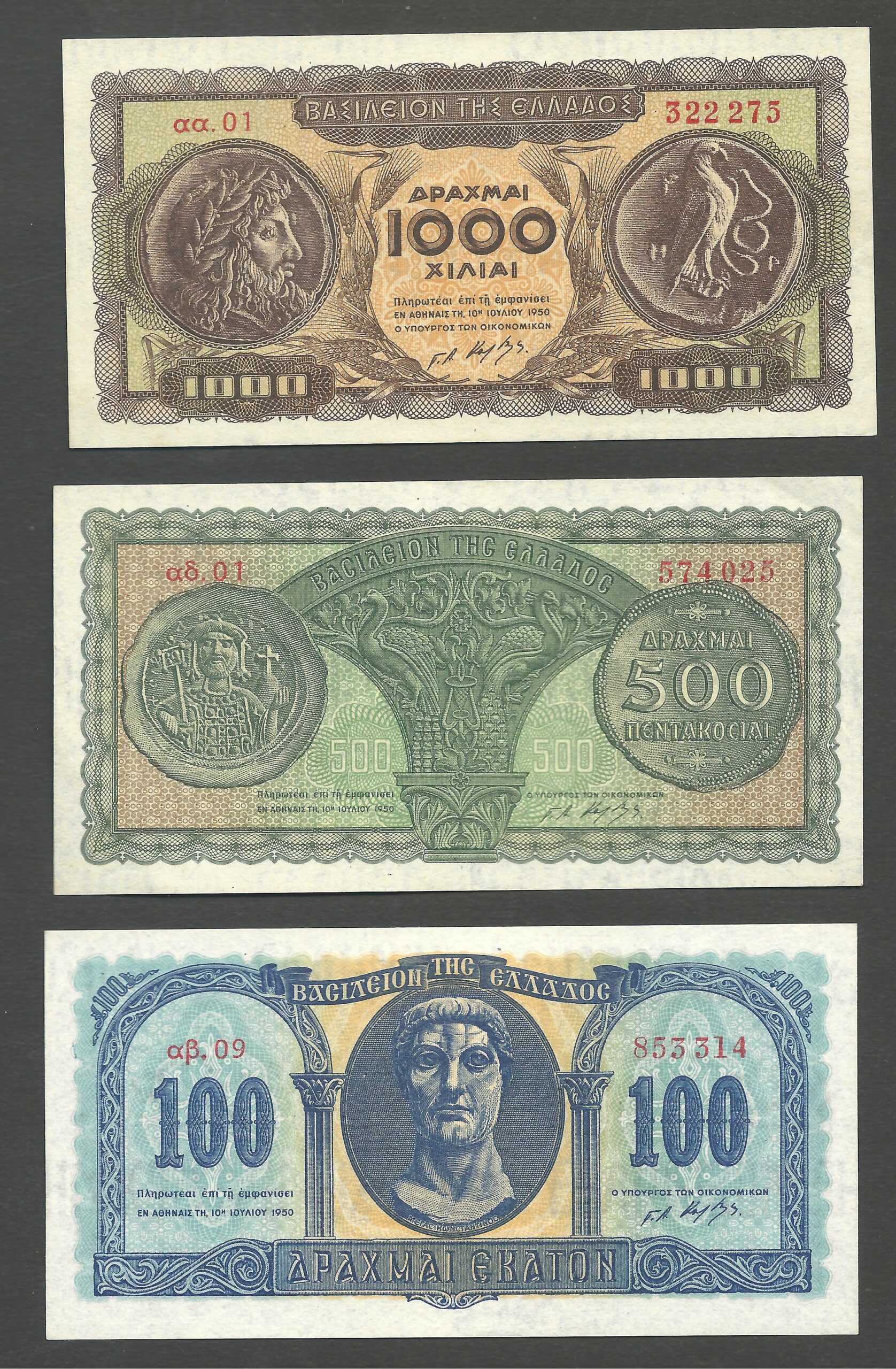 SET 1000DR.-500DR.-100DR. 1950/10/07 COMPLETE UNC