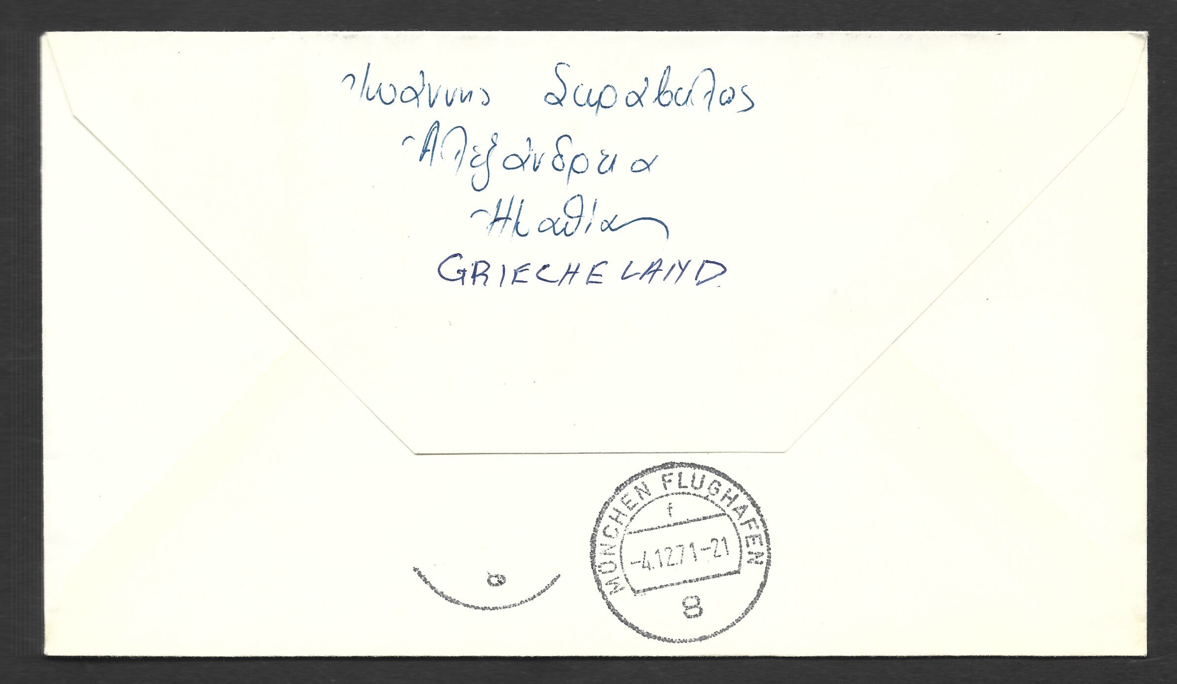 1971/04/12 Commemorative first fligt cachet “ATHENS- MUNICH” Lufthansa Boieng 737 in pictured envelope. Dimensions 17.8cm X 10cm.