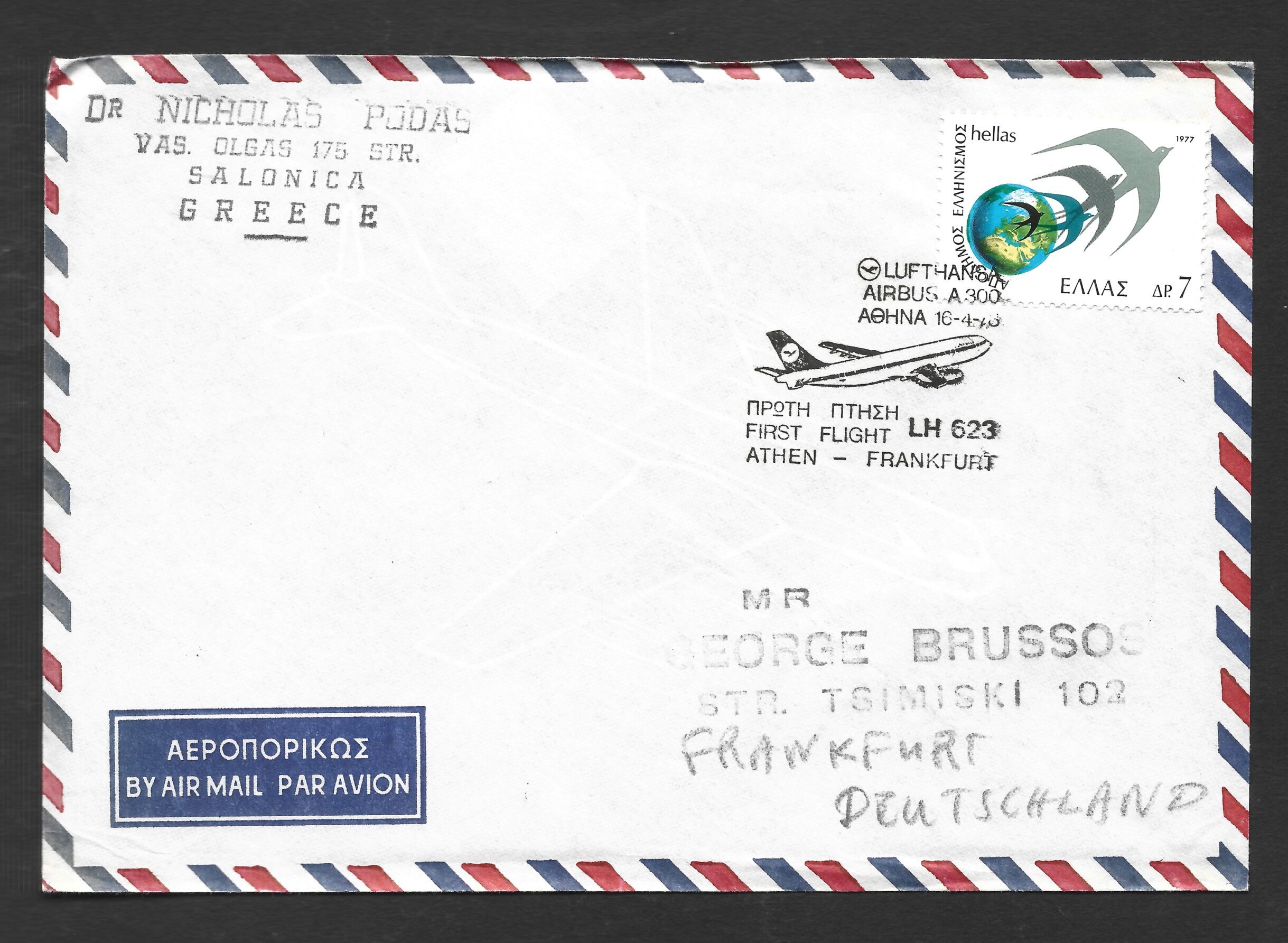 1978/16/04 Commemorative first fligt cachet “ATHENS-FRANKFURT” Lufthansa Airbus A300 in airmail envelope. Dimensions 16.5cm X 11.5cm.