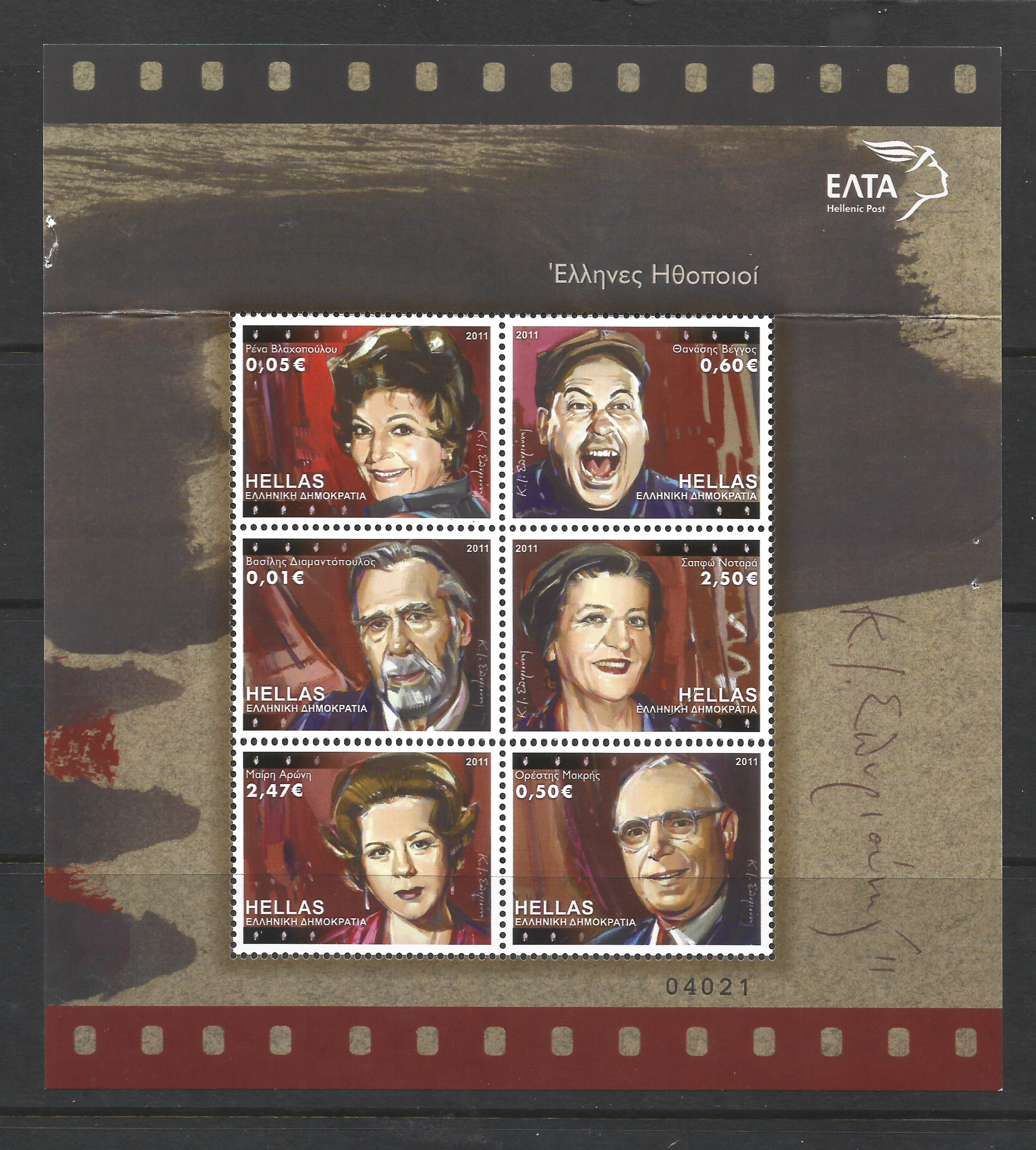 2011 Miniature Sheet Commemoretive Issue “Greek Actors”. Stapler pin holes on the edge. Upper perforation folded.