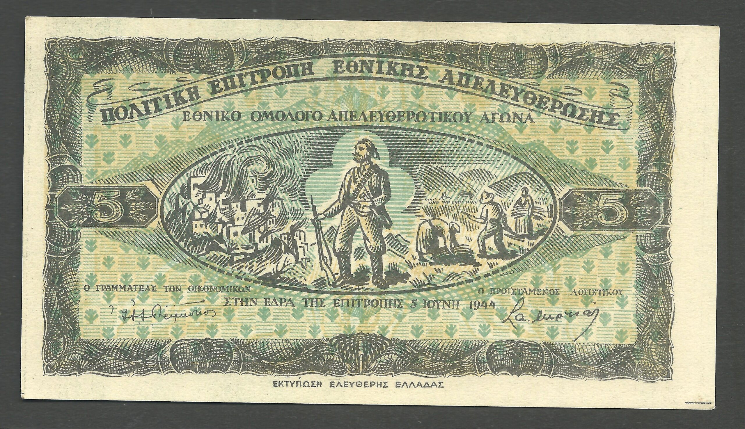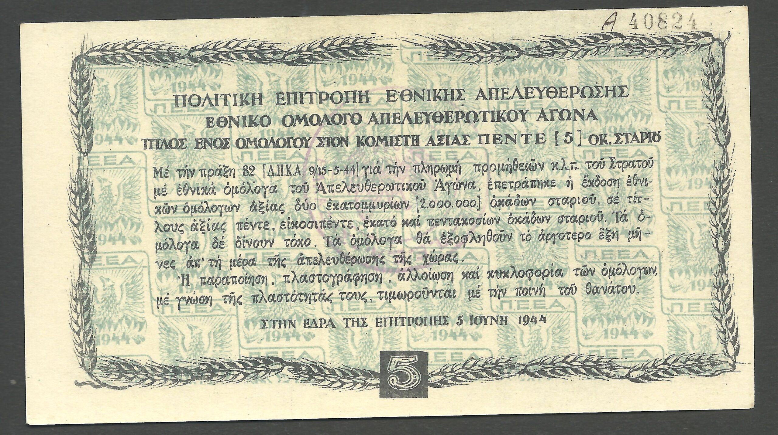 5 OKAS 1944/05/06 “MOUNTAIN GOVERMENT” ‘CENTRAL GREECE VIOLET CACHET”. “Hellas 278f”