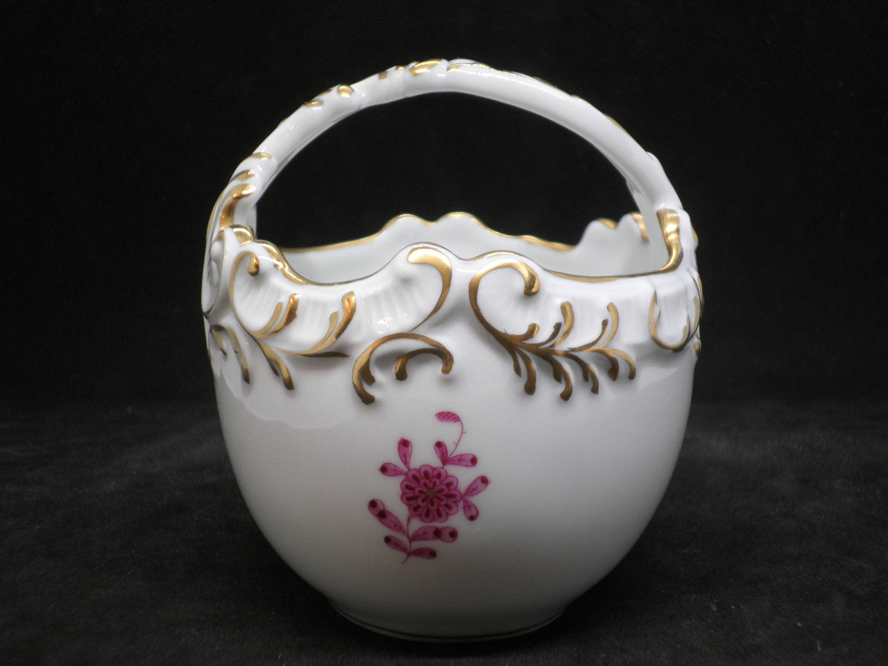 Antique porcelain basket “HEREND” handmade ane handpainted in Raspberry. Fine Hungarian porcelain. Height 10cm, length 11cm, weidth 8.5cm.