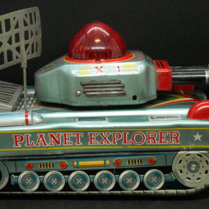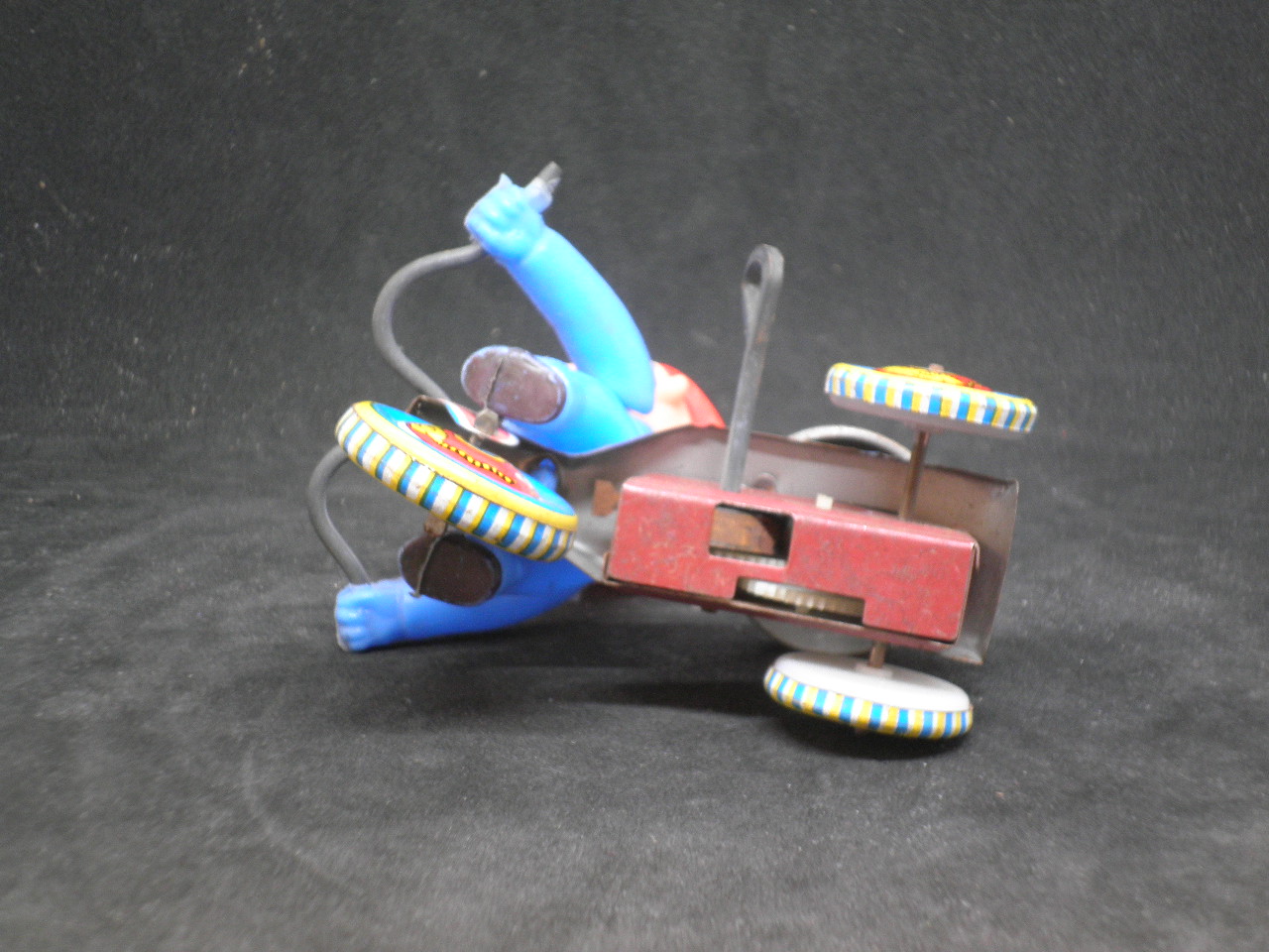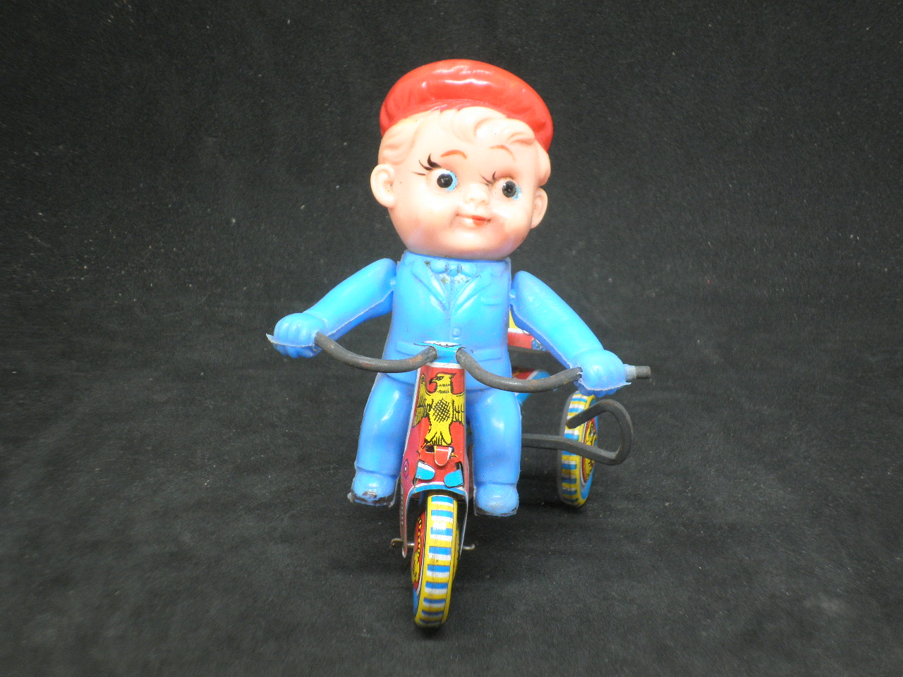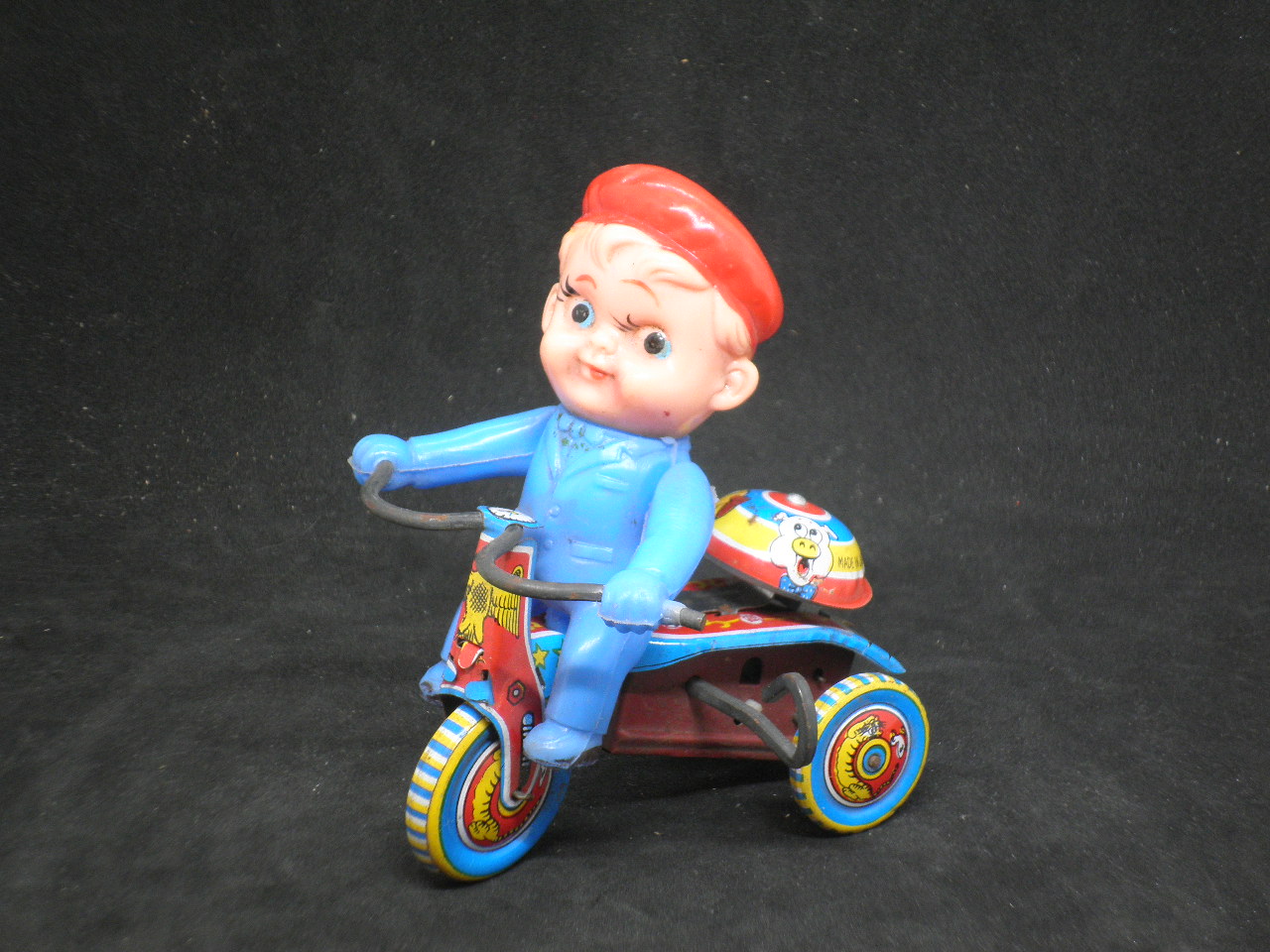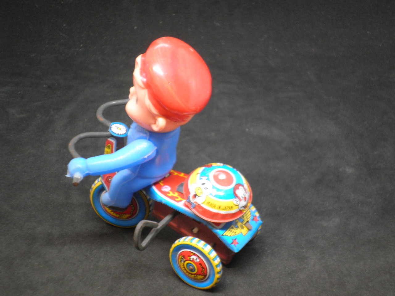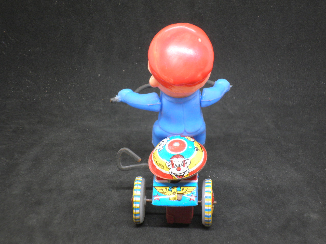 Antique wind-up bicycle with tin bell, functional, in excellent condition. Made in Japan. Length 10cm and height 12.5cm. When it is tuned it goes forward and rings the bell back.