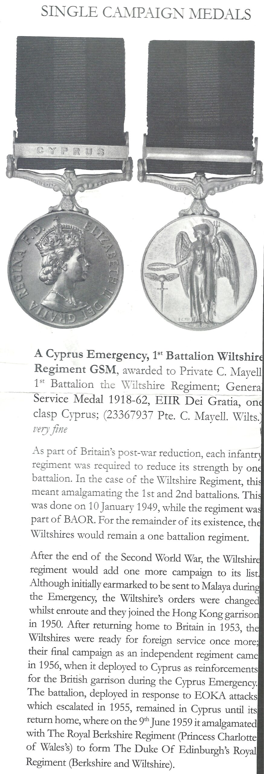 ENGLISH MEDAL “CYPRUS” AWARDED ON 1959 TO Pte. C.MAYELL WILTS NUMBERED.