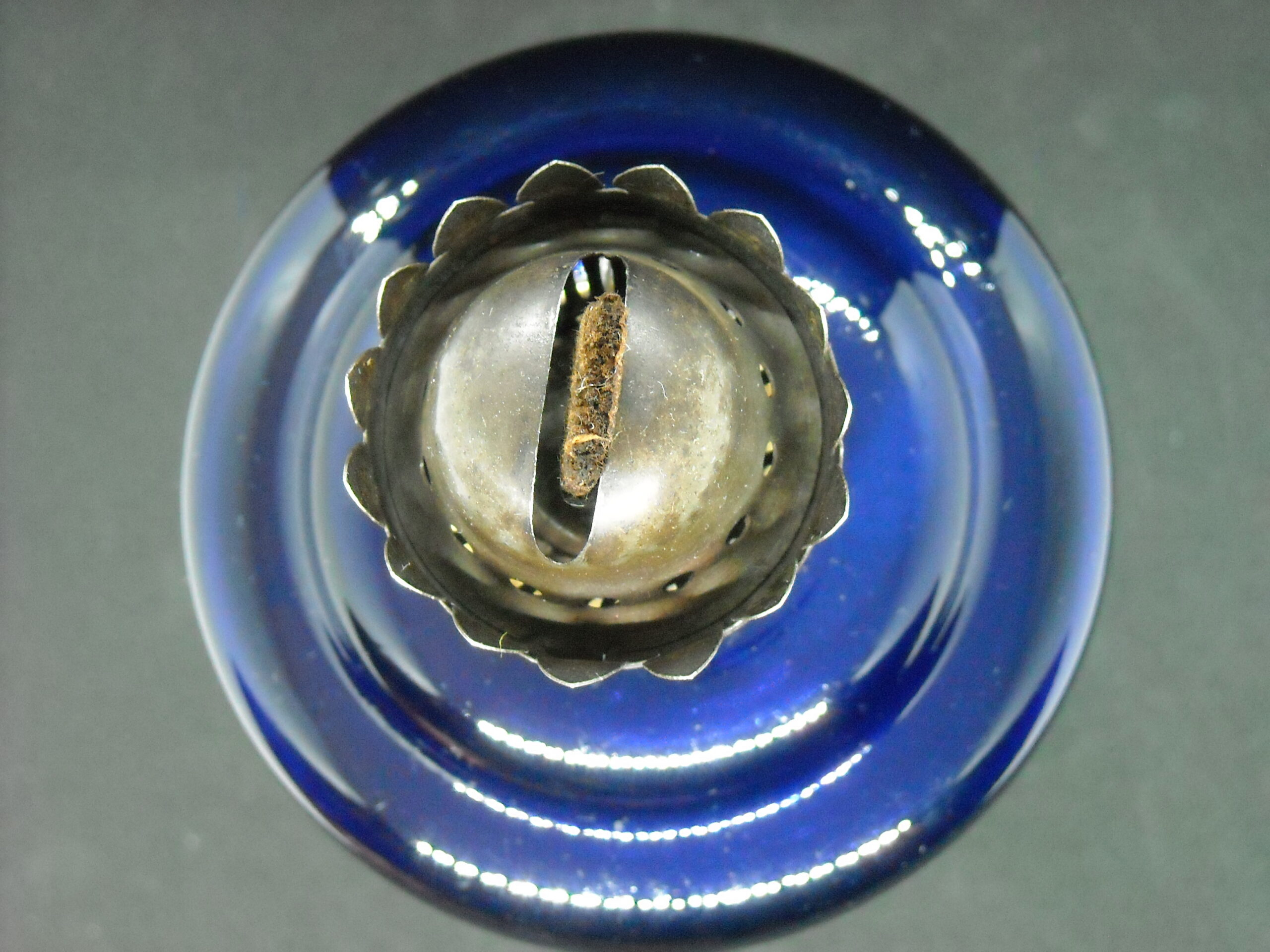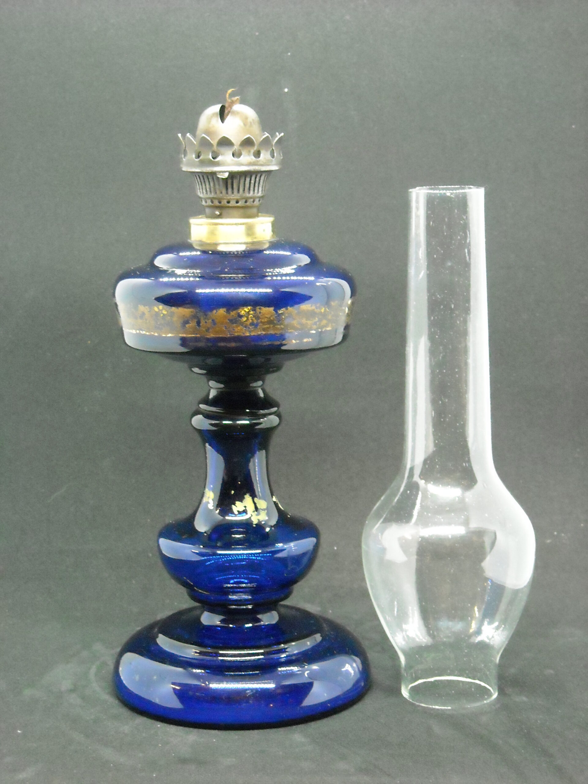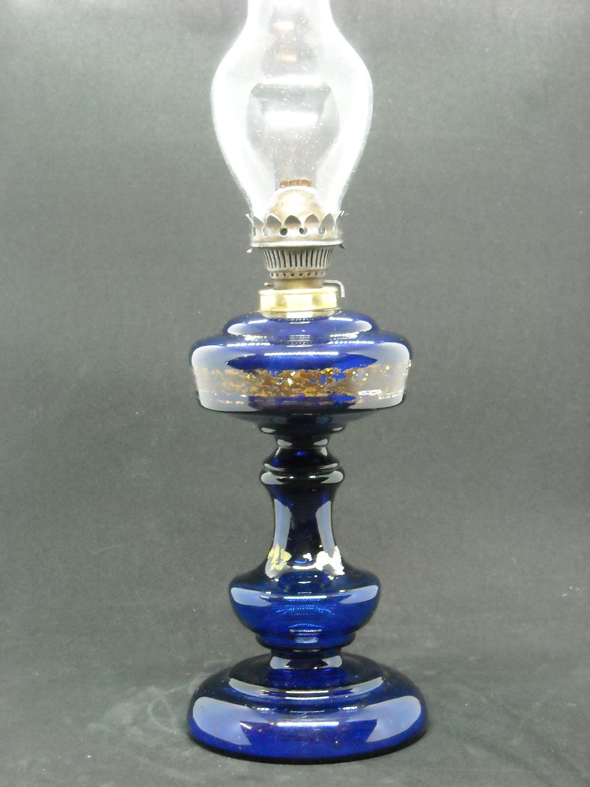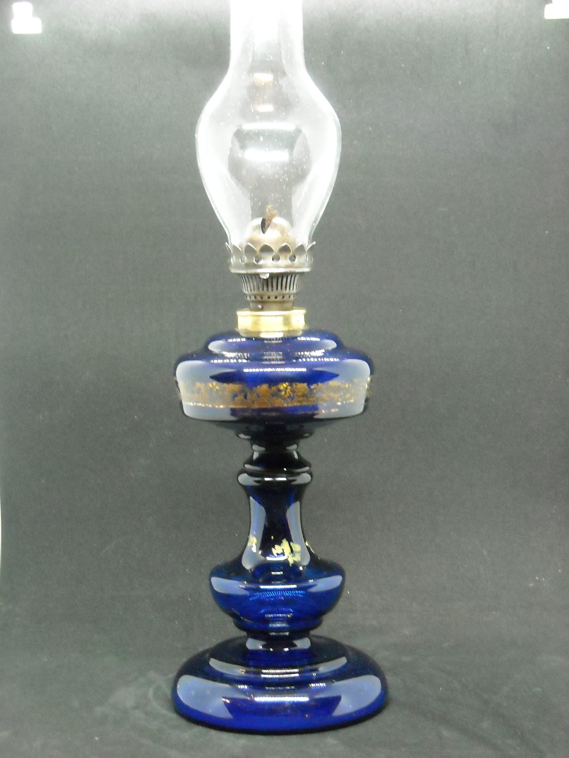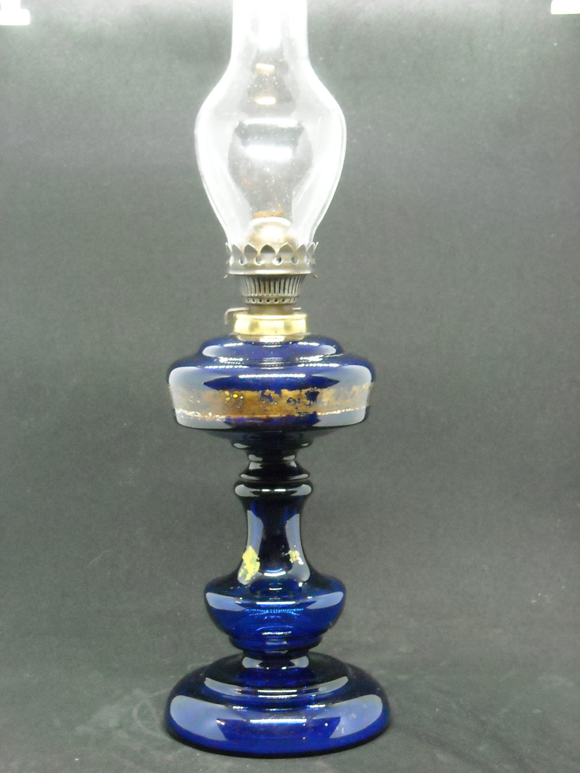 HANDMADE OIL GLASS LAMP IN COBALT BLUE COLOUR LATE 19th BEGINNING OF THE 20th. SOME WEAR FROM USE.