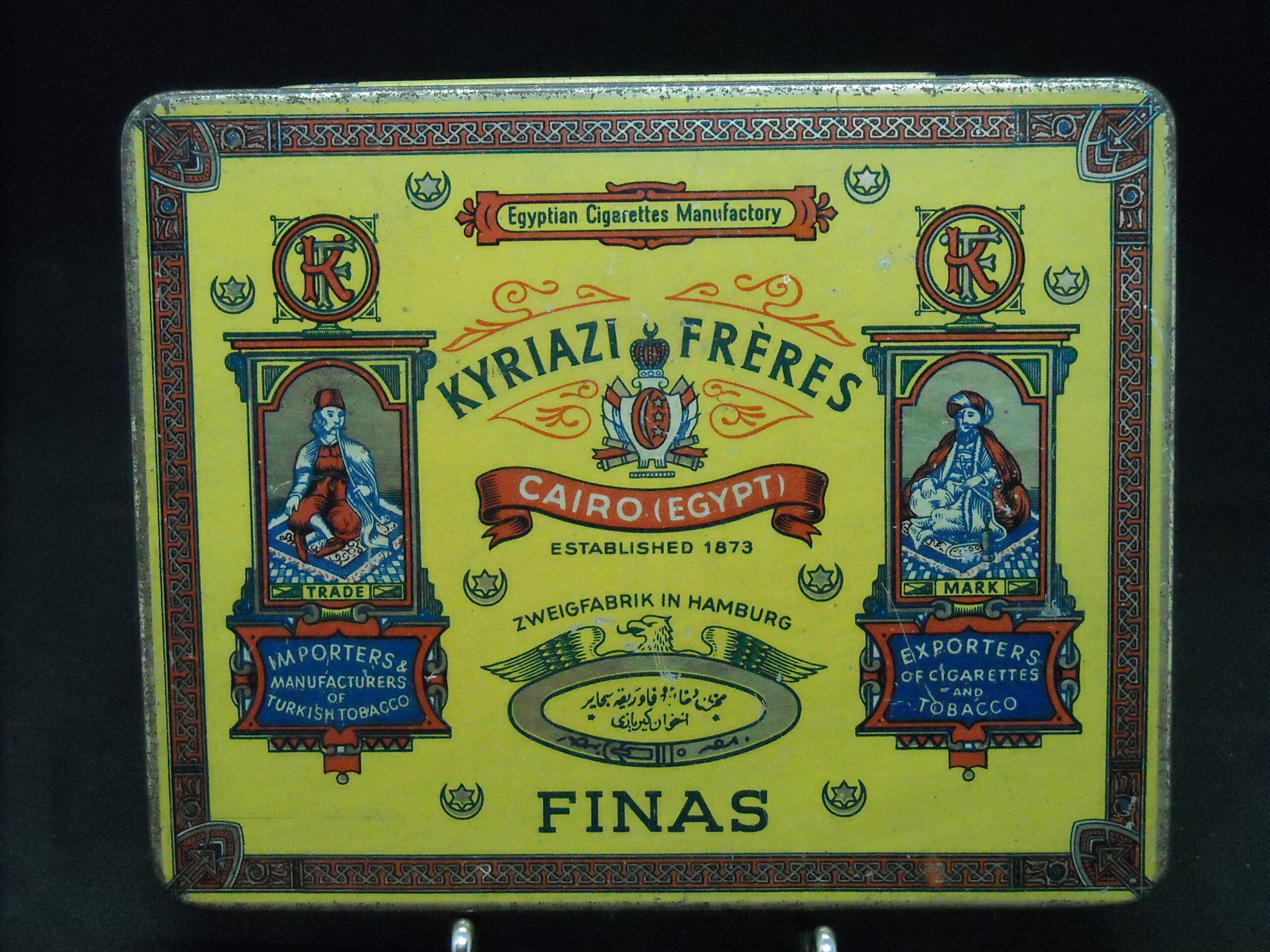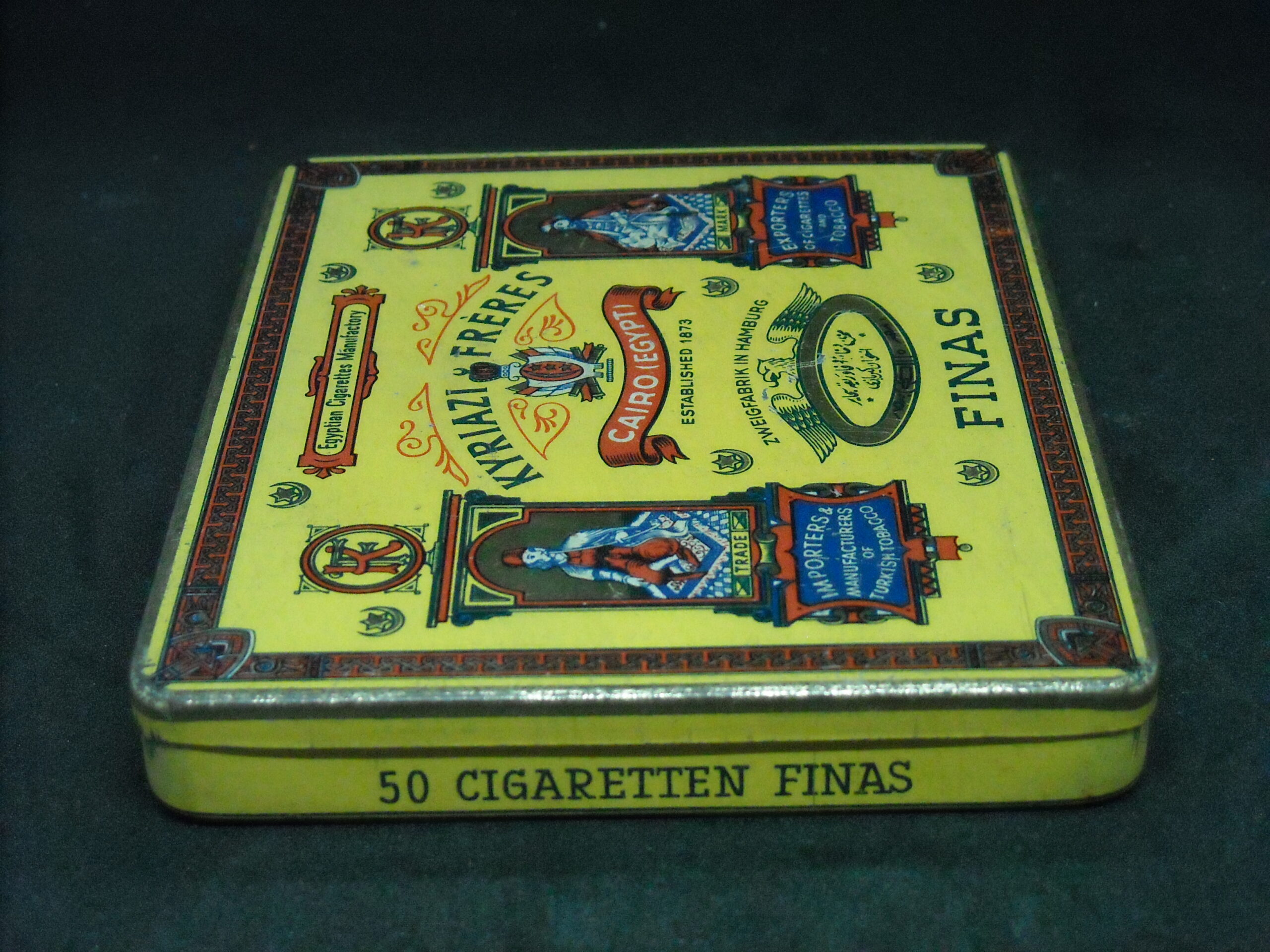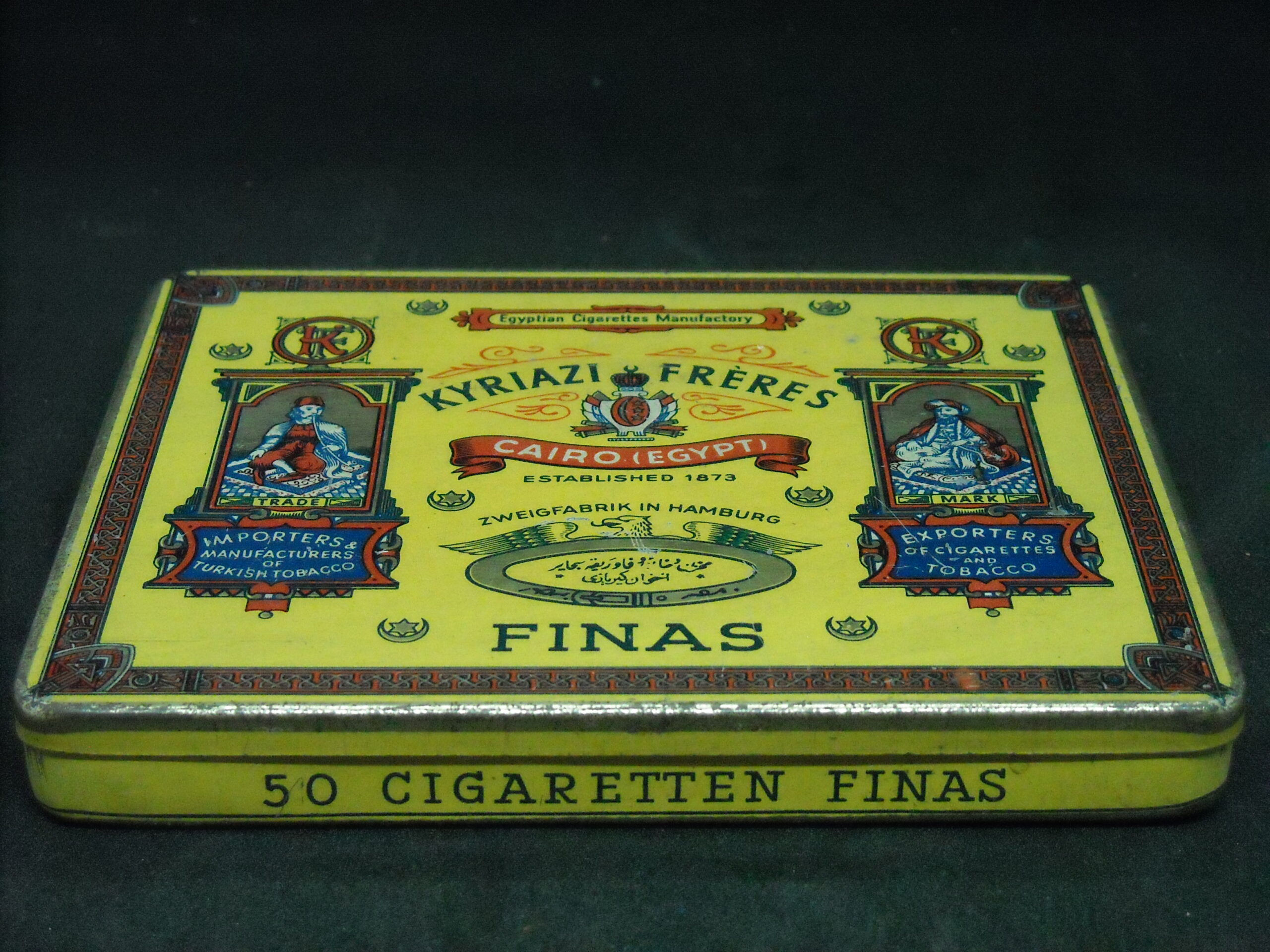 “KYRIAZI FRERES – FINAS” EGYPTIAN TIN CIGARETTE LITHOGRAPHIC BOX. DIMENSIONS APPROX. (13.5cm X 11cm X 2cm)