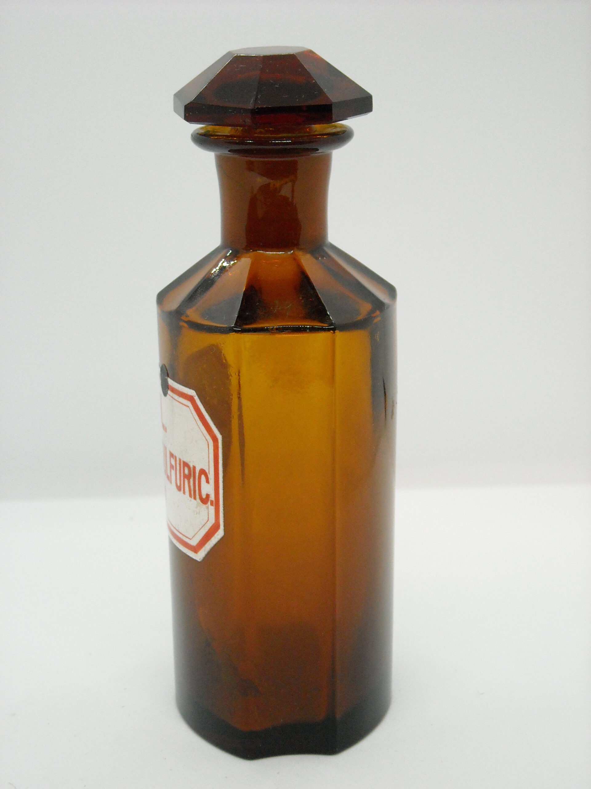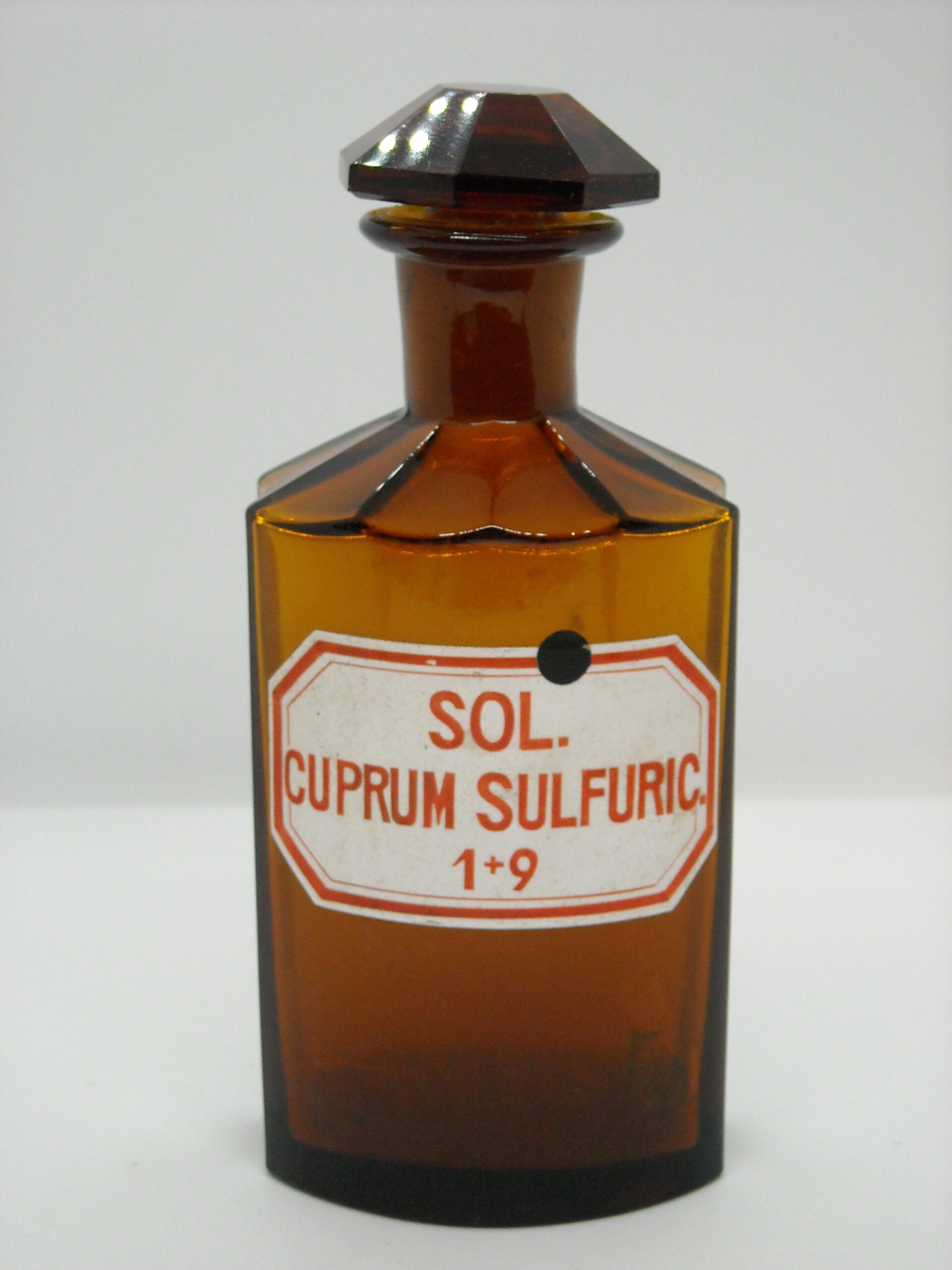 OLD GERMAN PHARMACY BOTTLE “SOL. CUPRUM SULFURIC 1+9” WITH SOME WEAR FROM USE.
