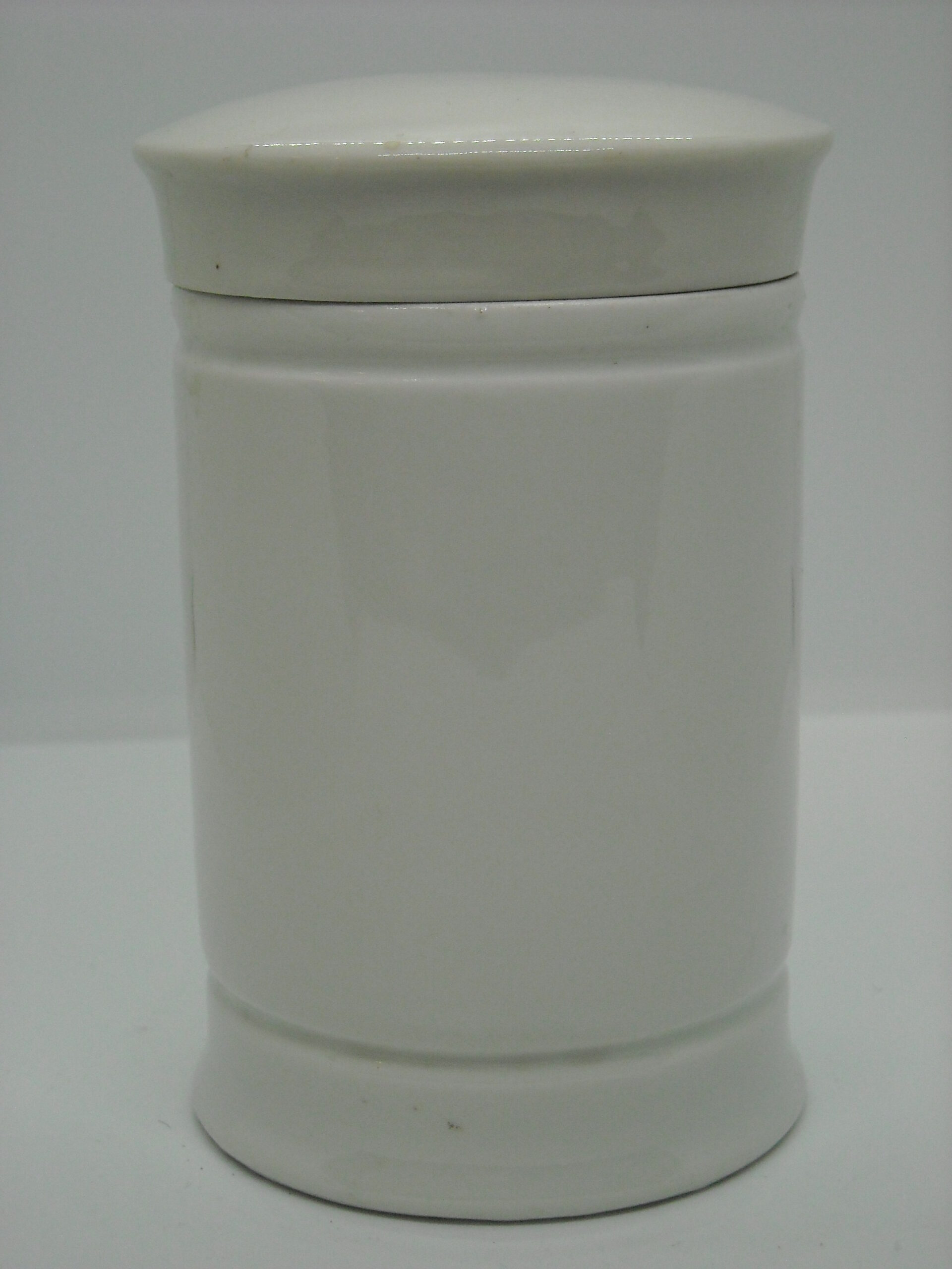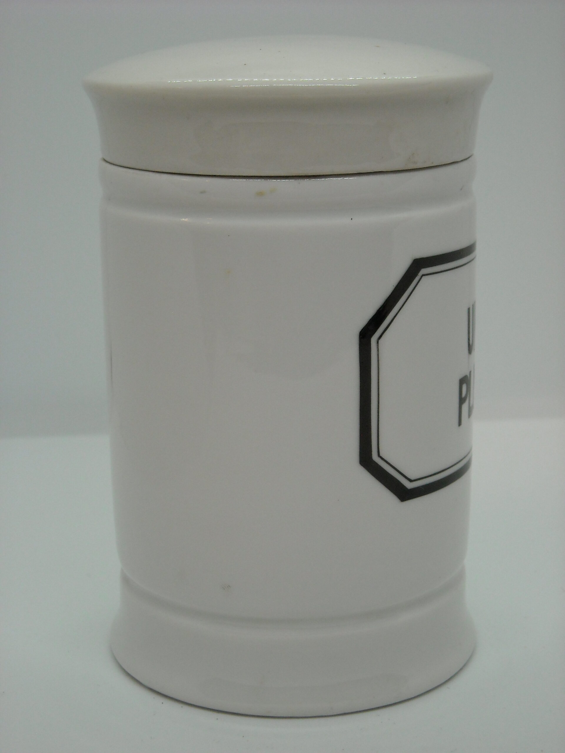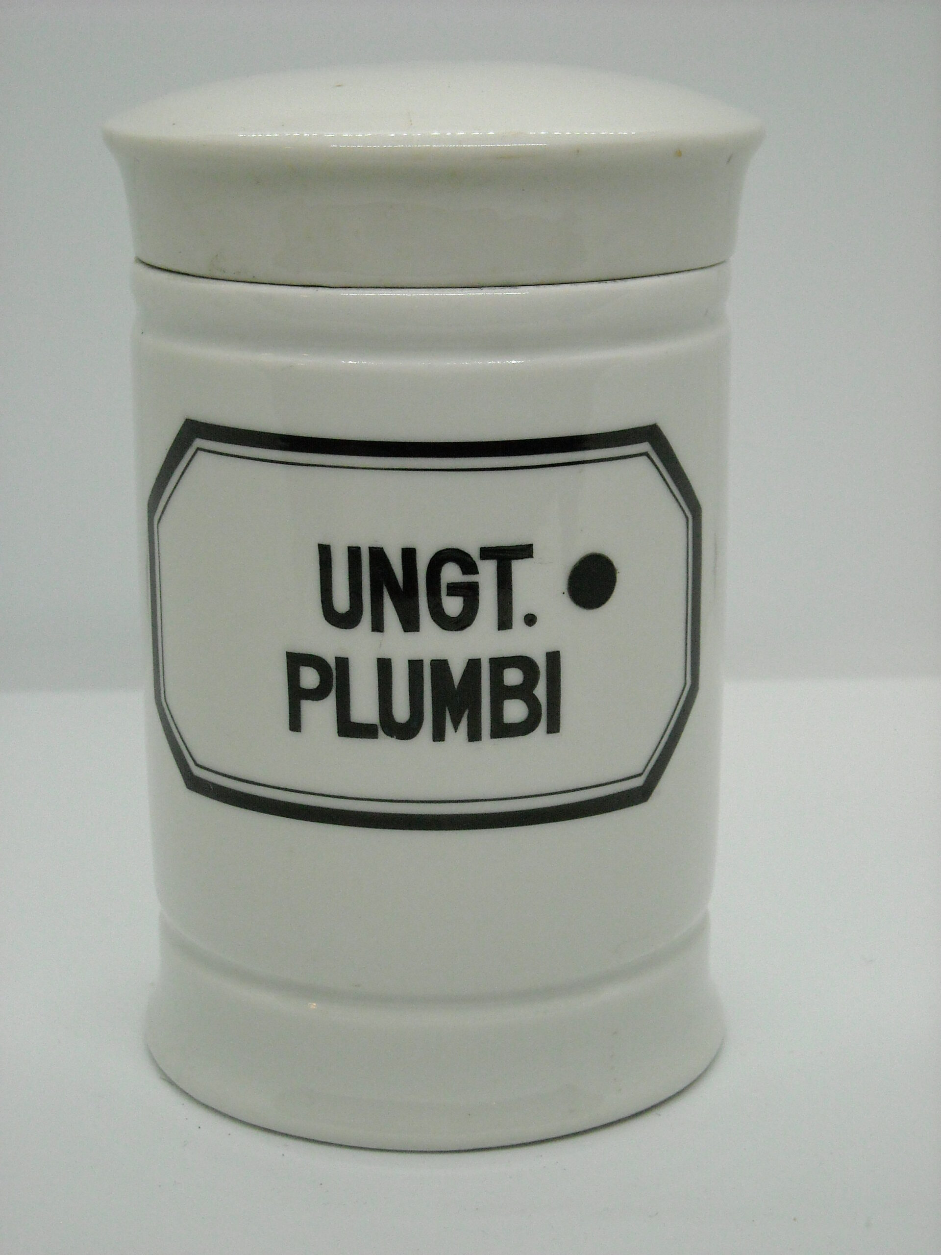 OLD GERMAN PHARMACY PORCELAIN CONTAINER “UNGT PLUMBI” WITH SOME WEAR FROM USE.