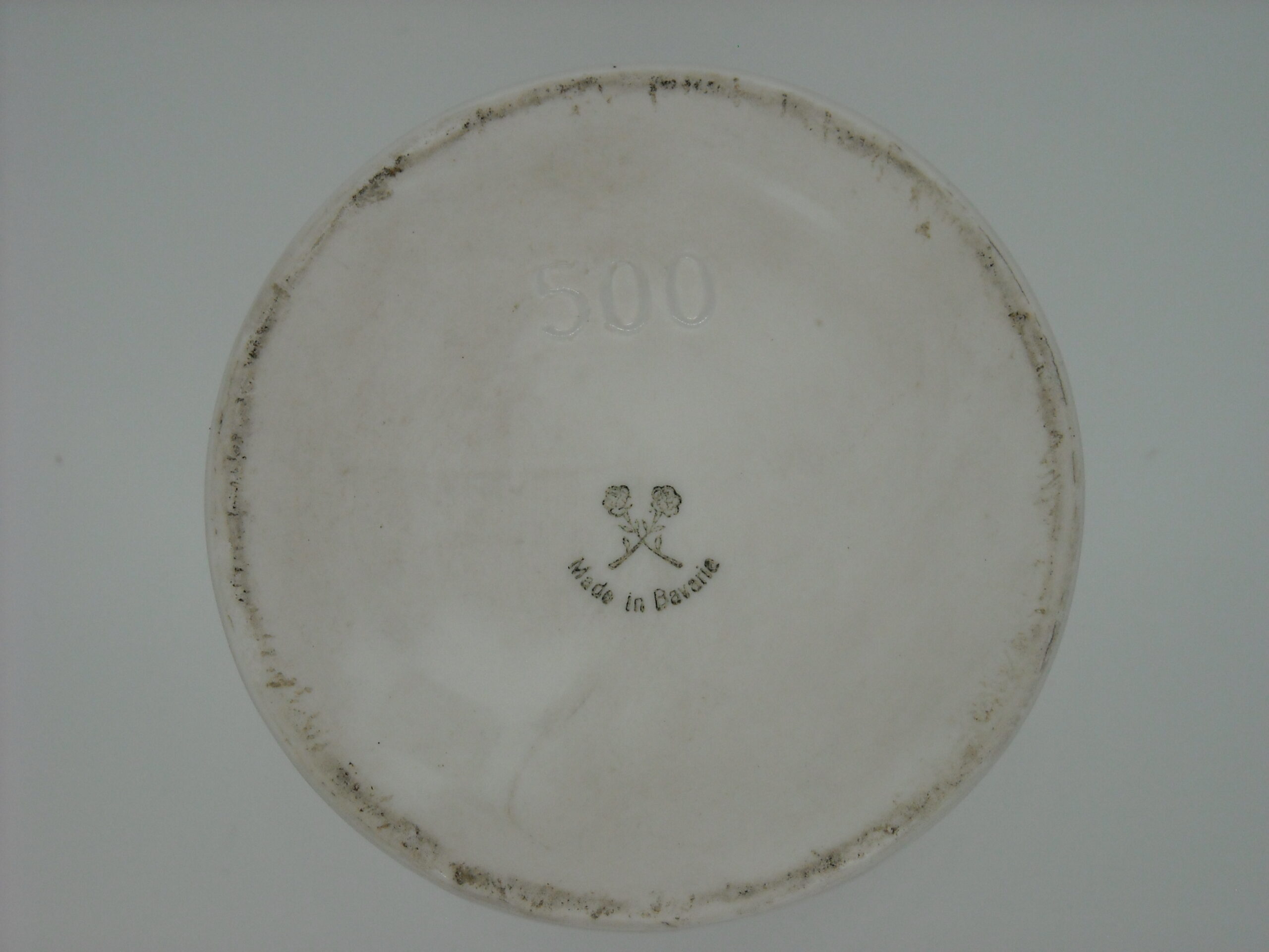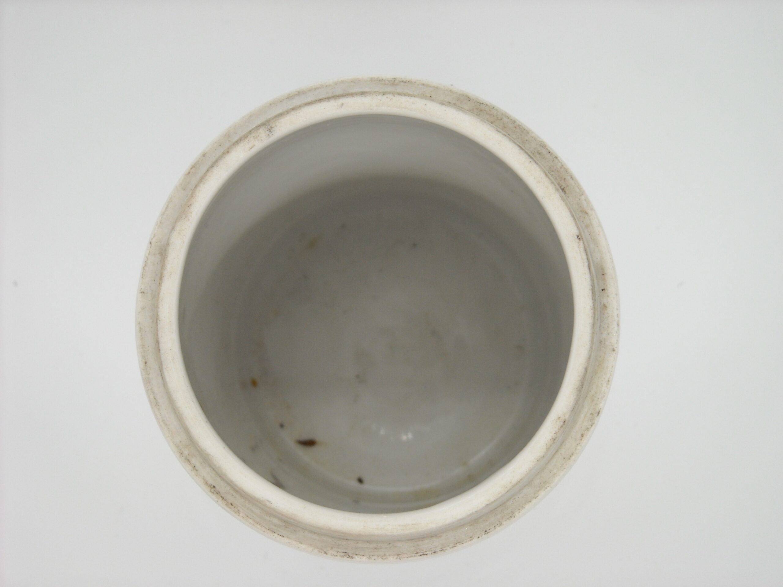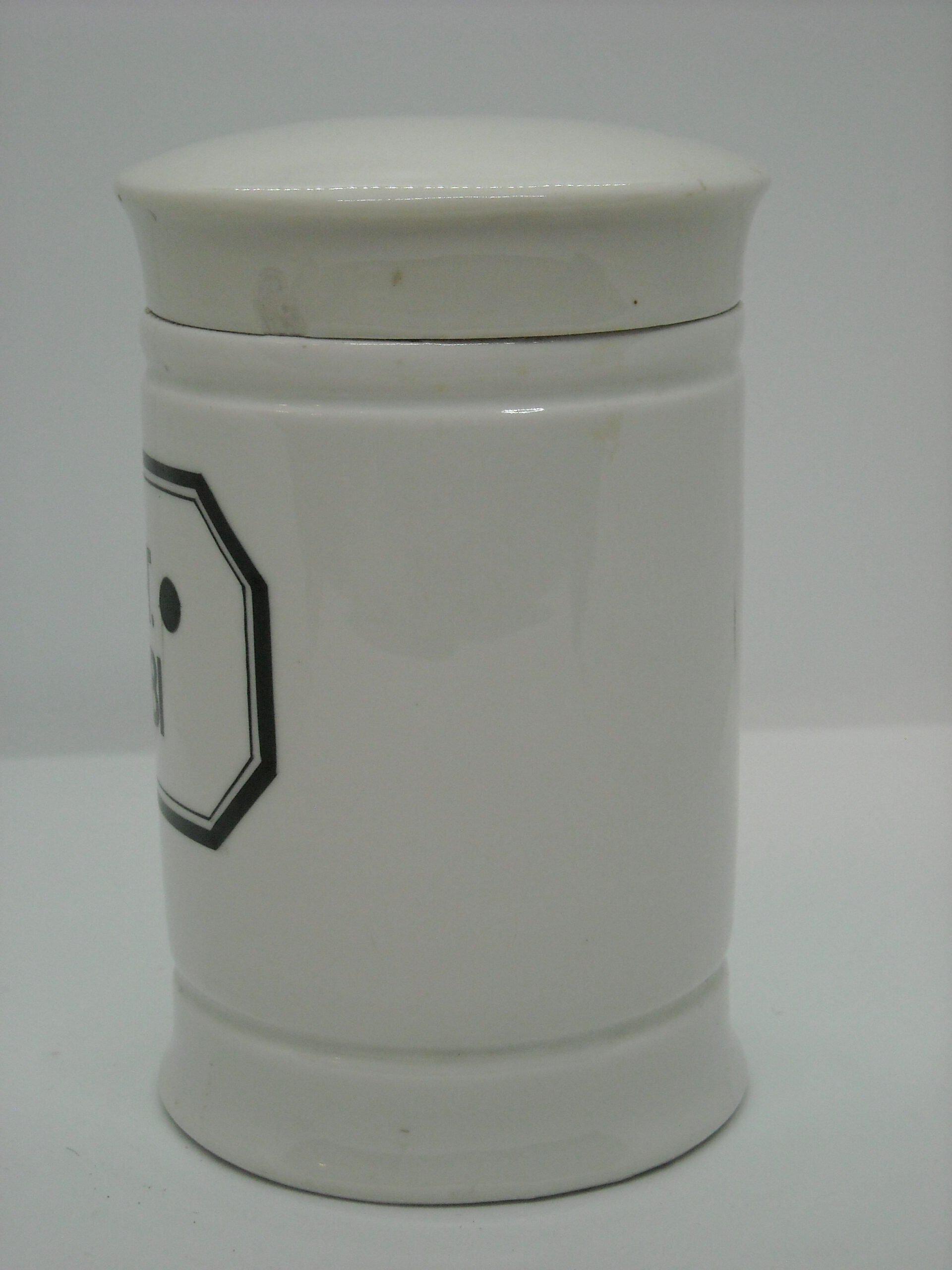 OLD GERMAN PHARMACY PORCELAIN CONTAINER “UNGT PLUMBI” WITH SOME WEAR FROM USE.