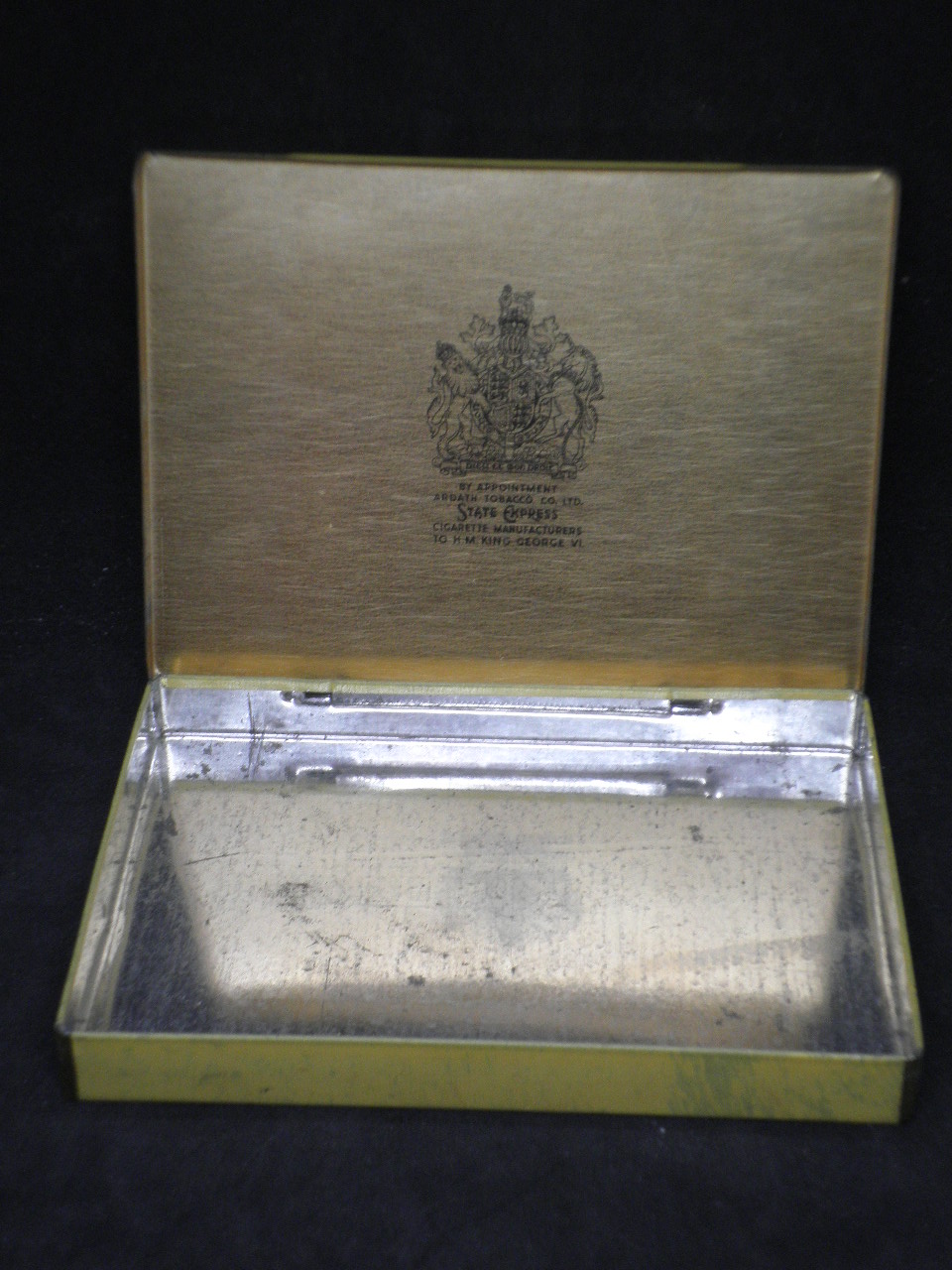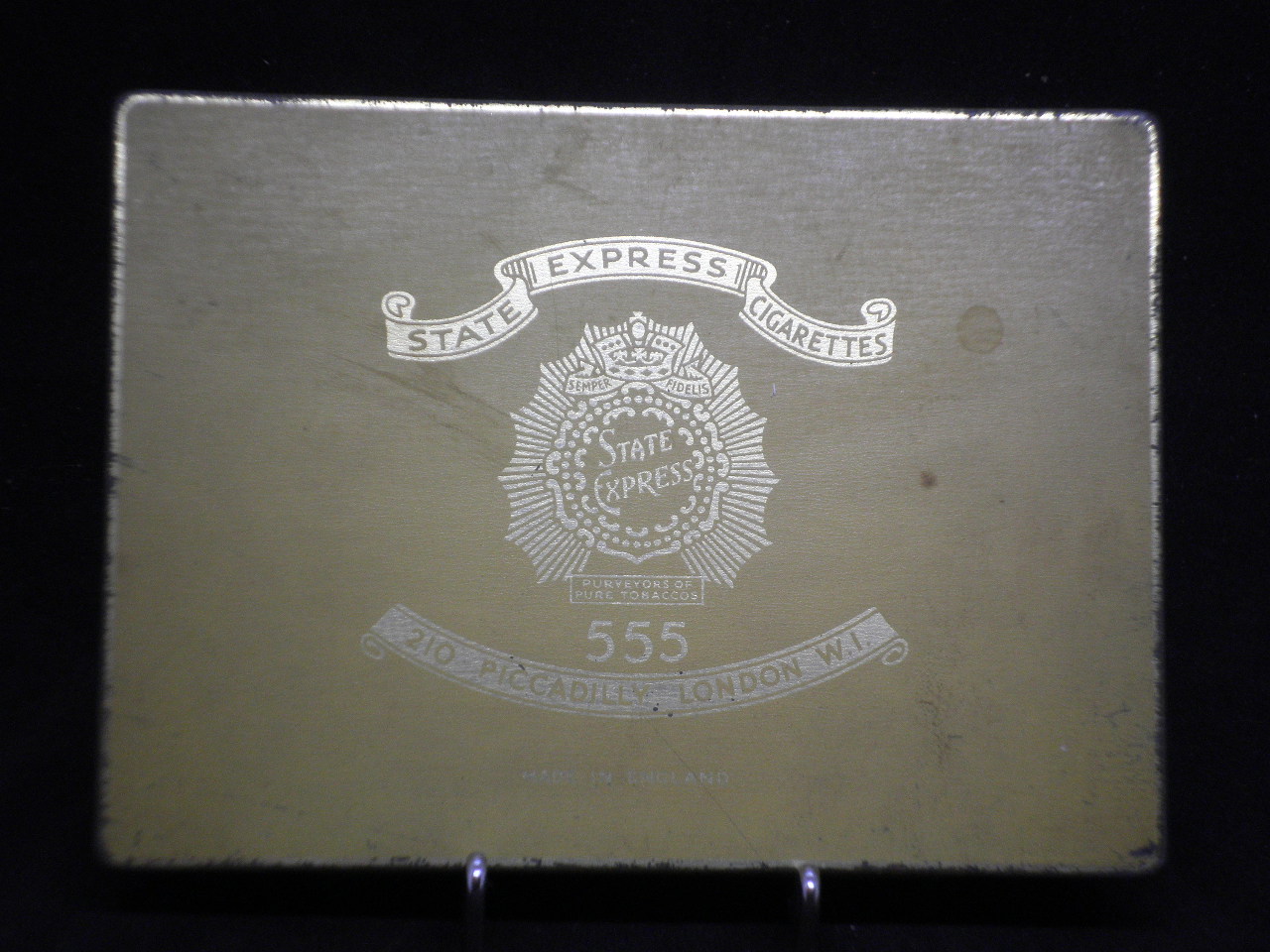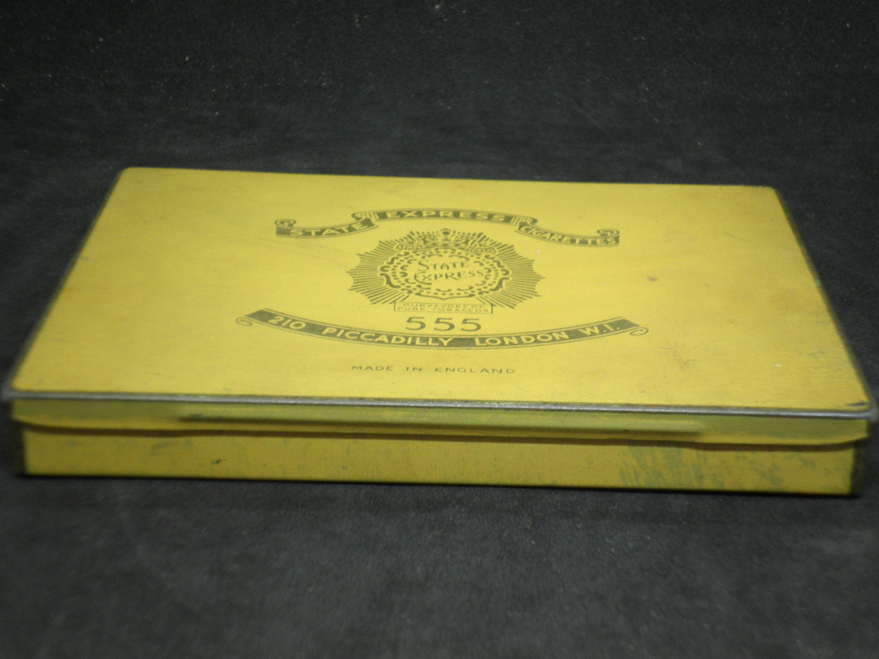 Vintage tin cigarette box "555 STATE EXPRESS" made in England in yellow color with dimensions 15cm x 11cm x 2cm. in good condition with wear.