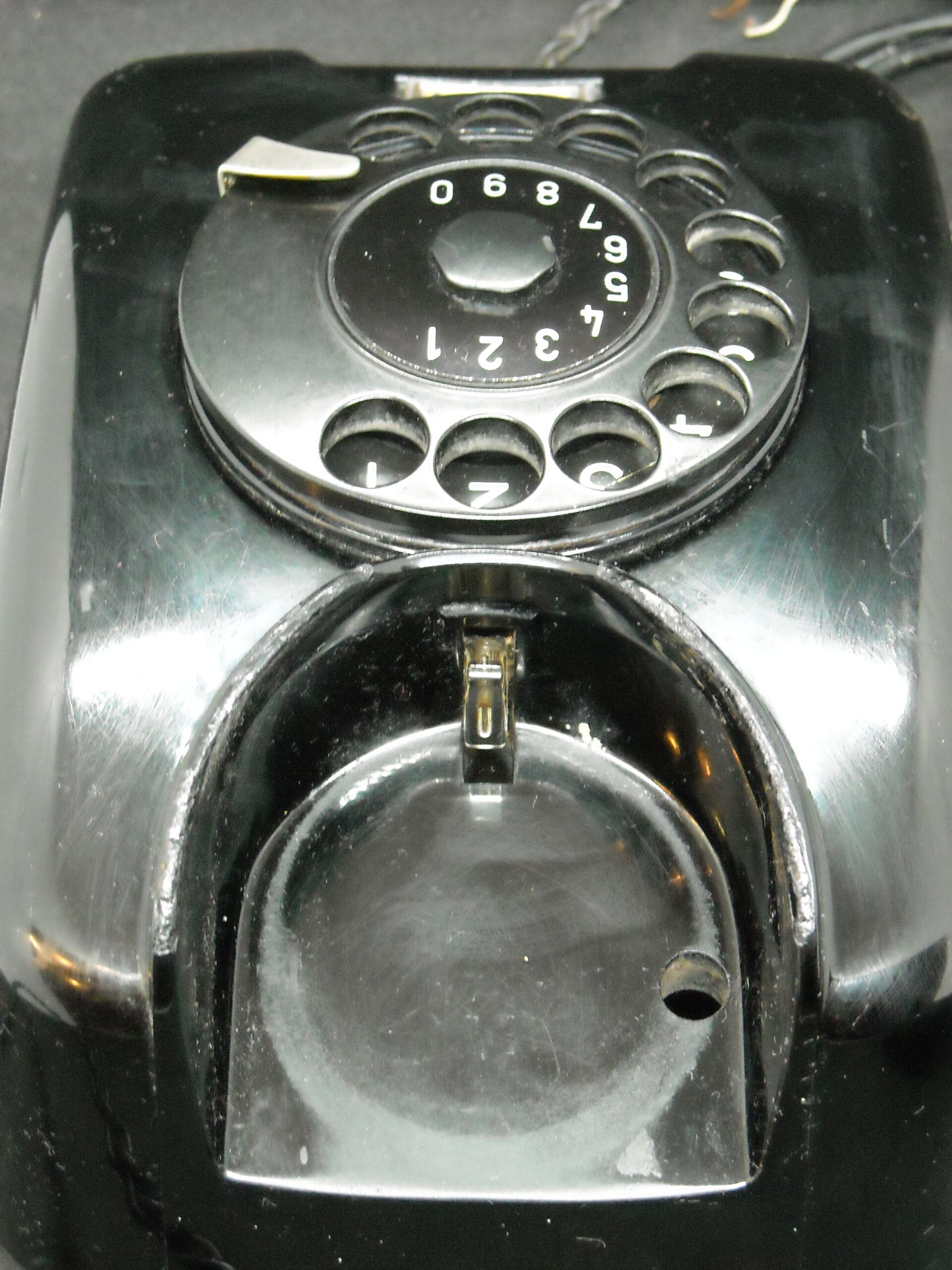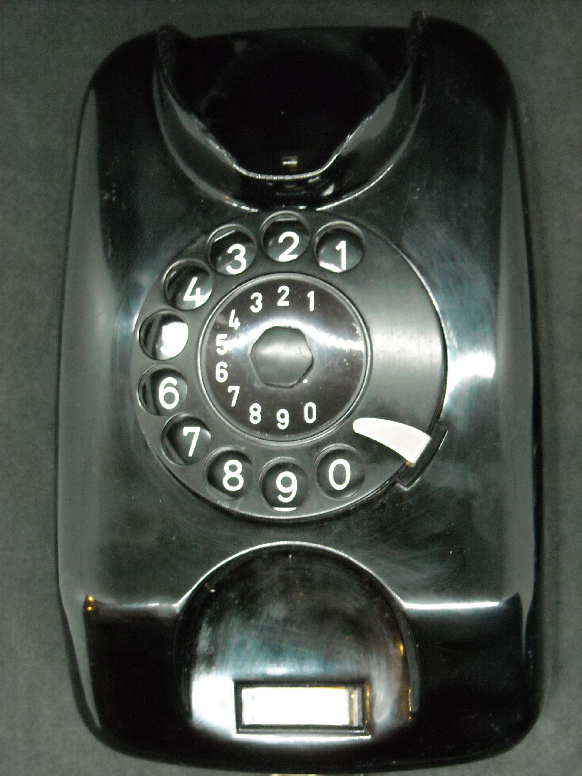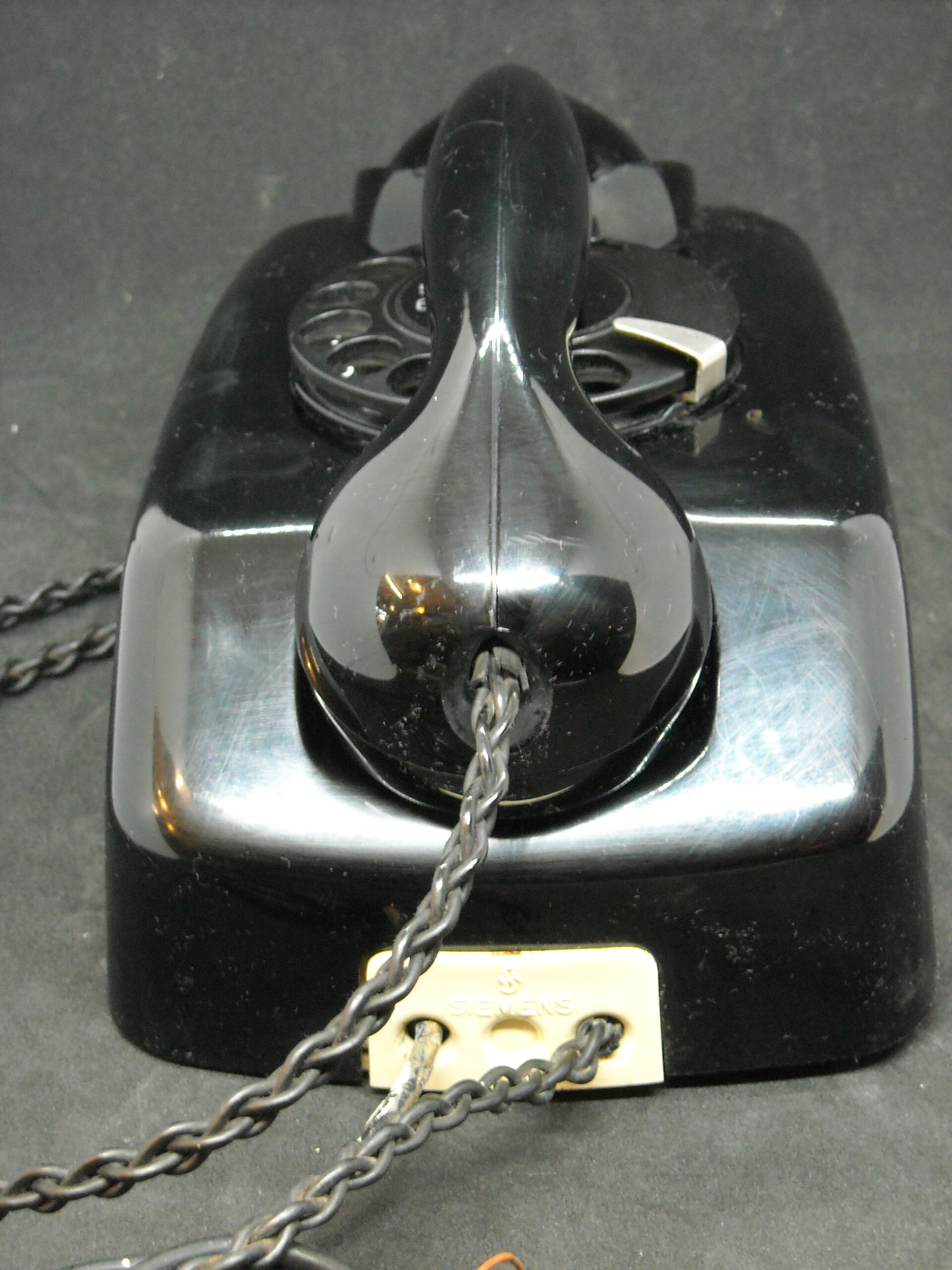 Vintage wall telephone "SIEMENS" in black functional with wear. Dimensions: 13cm deep X 14.5cm wide X 22cm high.