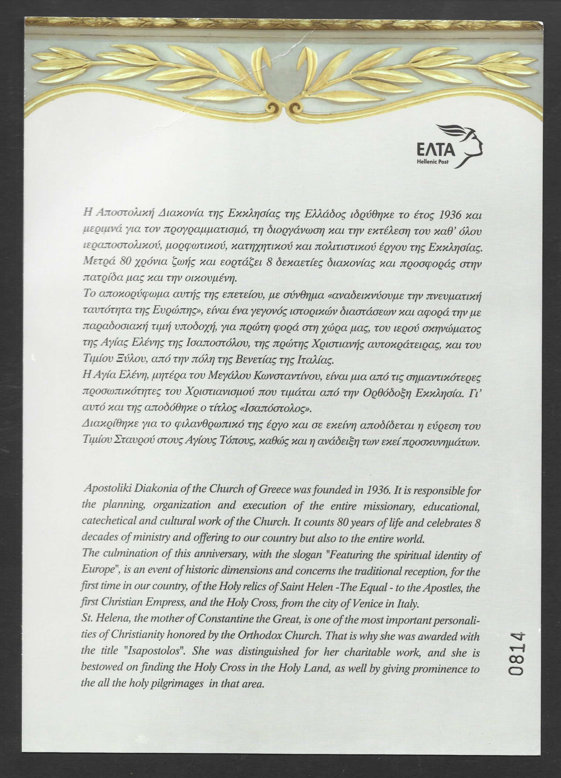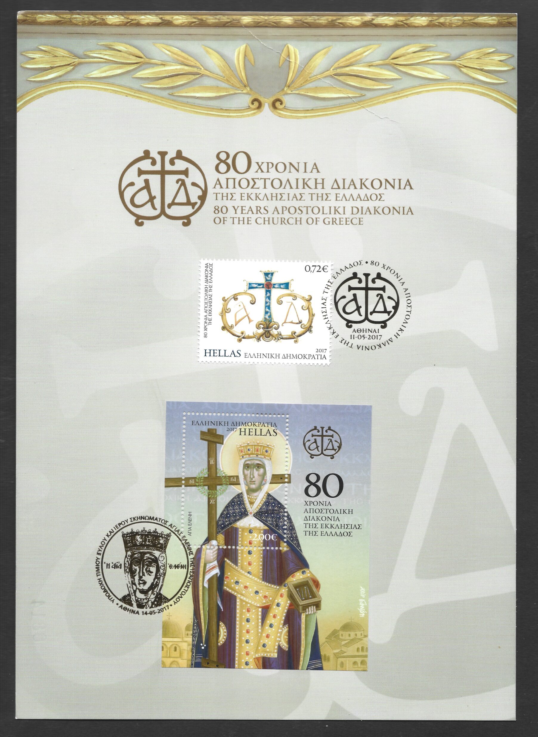 2017 Π.Η.Κ. Φεγιέ(Χωρίς αρίθμηση) + Γραμματόσημο “80 Χρόνια Αποστολική Διακονία της Εκκλησίας της Ελλάδος”. Ποσότητα κυκλοφορίας 5.000? τεμάχια. Ο αριθμός παραγωγής που φαίνεται στην φωτογραφία μπορεί να διαφέρει από αυτόν που θα παραλάβετε.